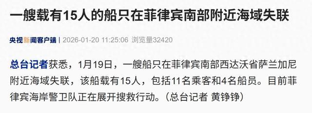 总台记者获悉,1月19日,一艘船只在菲律宾南部西达沃省萨兰加尼附近海域失联,该船载有15人,包括11名乘客和4名船员。目前菲律宾海岸警卫队正在展开搜救行动。
