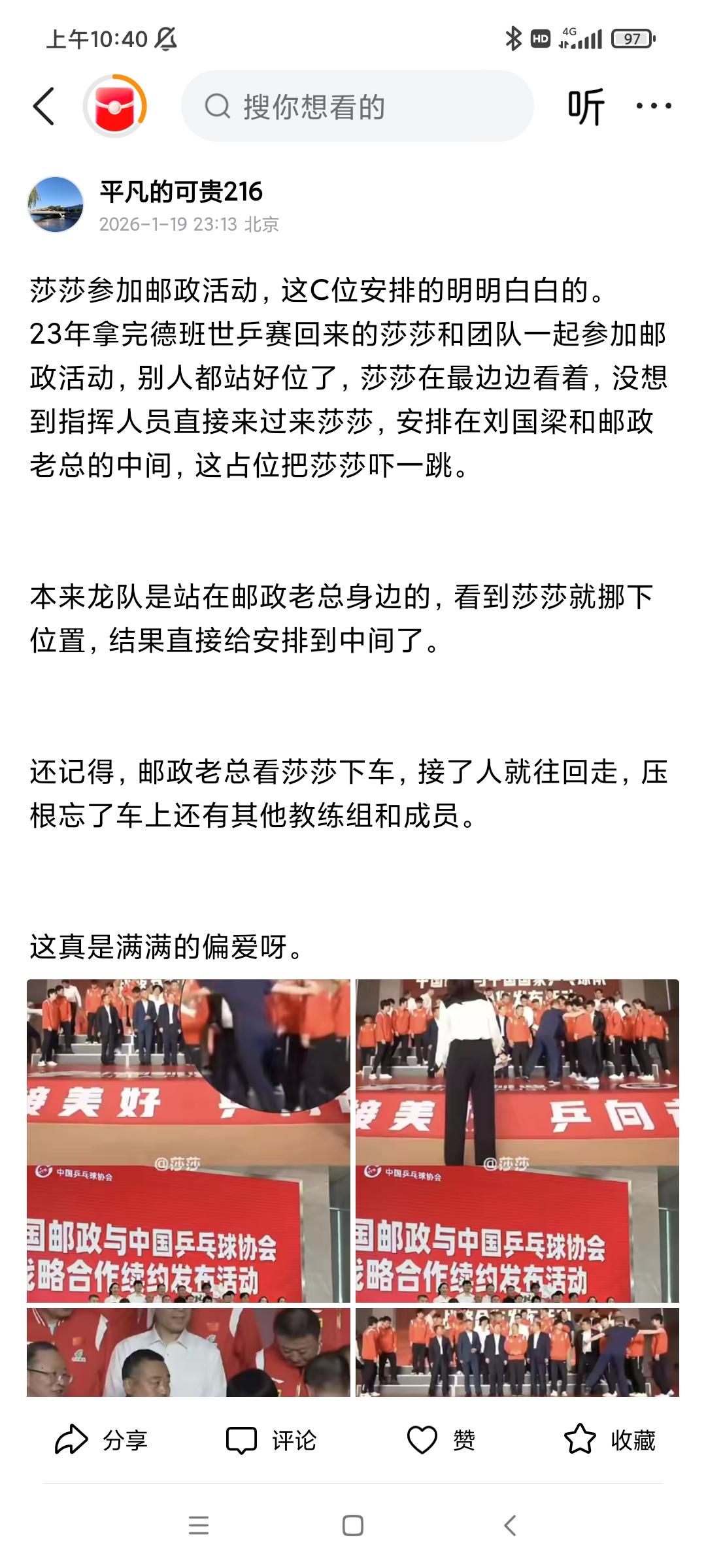 一群男人中间有个孙颖莎。 女性到达一定高度, 话语权就有了。 莎莎的话语权,不仅仅是打球打来的,还有她的人格魅力。 你看她待人接物,你看她对女生的关爱。 主持人可以穿羽绒服上台, 面对领导不卑不亢, 面对诱惑,坦然面对。 奥委会后台给的小礼物,不声张,不炫耀。 体育局领导招手让坐旁边,莎莎不忘后面的领导。确认后面领导的座次,才坦然坐下。 这就是莎莎!