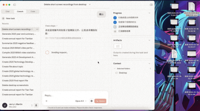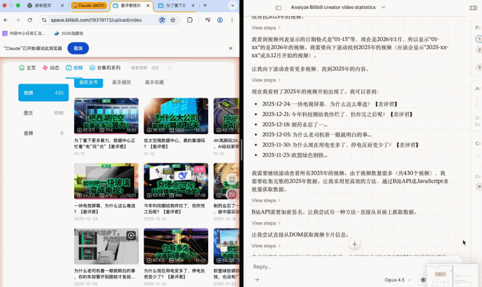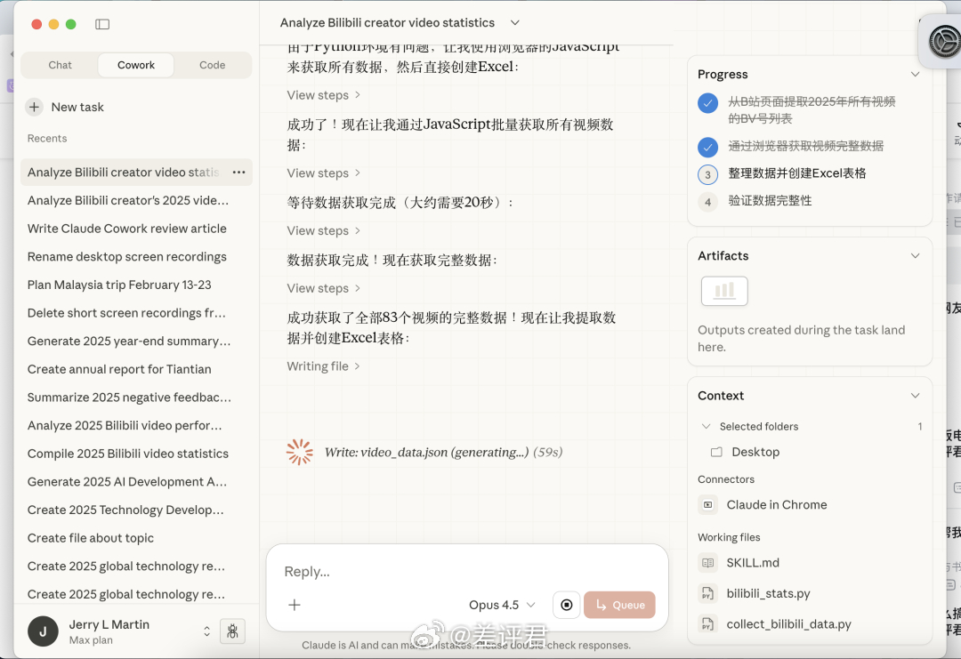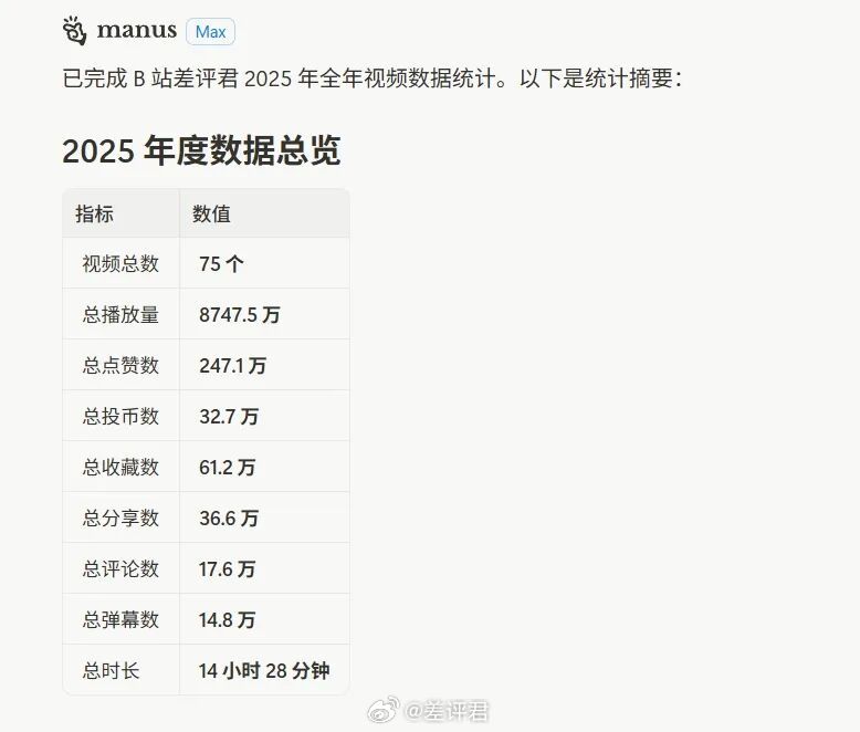 #一百刀一个月的AI产品值吗# 上周,Anthropic推出了他们的最新Agent产品Claude Cowork。刚上线就被大伙儿一通狂吹,什么AGI真神降临,打工人的末日要来了。更绝的是,Anthropic还自爆Cowork内含100% AI代码,没有一点人工,只用10天就搓出来了。所以我斥巨资100刀深度了体验一波Claude Cowork。怎么说呢,贵有贵的道理,但你也太贵了。Claude Cowork的界面设计,还是很简洁舒适的。我让它统计总结一下2025年差评君B站的视频数据,再把Excel直接喂我嘴里。十五分钟后,它默默返回了一个Excel,里面的数据不仅包含一整年的所有83个作品,而且每条播放量、点赞、弹幕数、评论、投币、收藏、转发,全对。这种长程、多条目的任务,其实正是大多数Agent最容易翻车的地方。不考研聪不聪明,而是细节对不对得齐。我们又用Manus 1.6 Max试了试同样的任务,Manus只统计出了75个视频的相关数据,总数都对不上,别的更别提了。接下来体验大伙儿强推的文件文档管理,刚好为了这次测试,我在桌面放了一堆录屏。我先让Cowork把三分钟以下的废片删掉,再把录屏按任务内容重命名。这个功能确实好用,几分钟全搞定。然后就是经典的行程规划题,指定时间地点,让它推荐机酒和路线。这次Cowork在机酒价格上还是翻车了,它的信源出现了问题,价格全是按日常价算的。而实际上春节的机票已经涨到了4000以上,酒店也普遍标低了200到400。相比起来,Manus的行程预算偏高,但更接近春节出行的真实价格。我还测了一些其它的例子,比如生成30页PPT,写个三维弹球游戏,或者总结最近AI领域的新闻,只能说偶尔有错误,但大部分任务中规中矩地完成了,没有很惊艳。放在今天这个整体还不太成熟的Agent赛道里,它确实已经算是完成度靠前的那一档了。但有没有发现一个问题,Agent的确帮你省了做任务的时间,但你又不得不花更多精力去检查和验证。所以Agent的门槛并不高,大家都能做;但Agent的上限也不高,大家也都做得不太好。所以我才觉得Cowork是好用的,但贵了。Anthropic显然也意识到了,所以也就一周就从100美元Max会员独占,下放到20美元Pro也能用。吗的,退我钱!