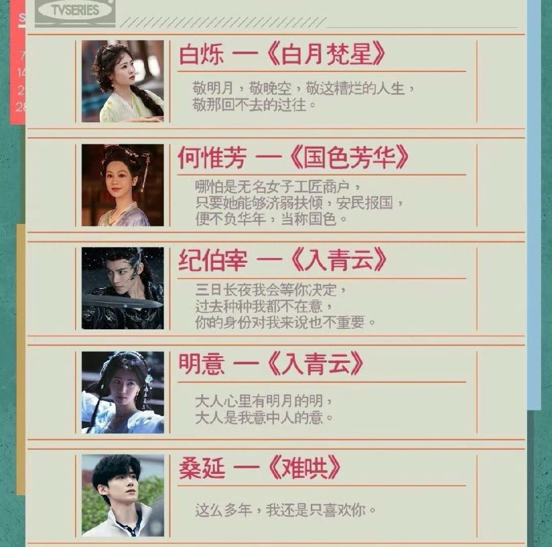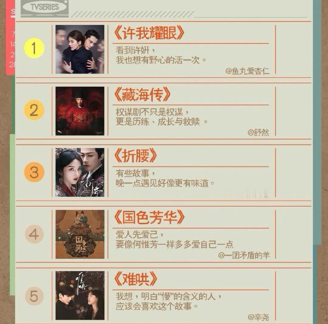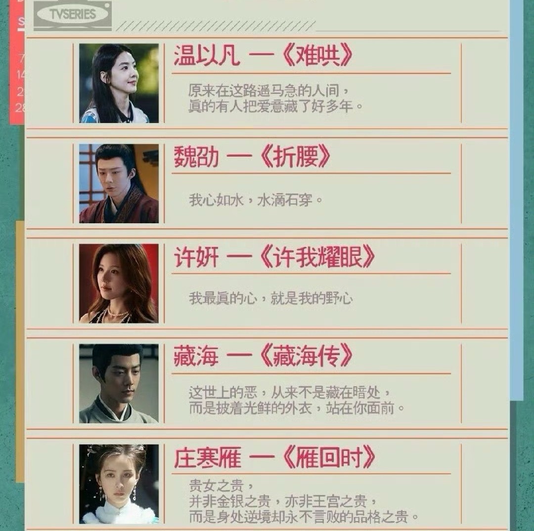 2025十大热门角色2025年度热门剧集 2025年度热门剧集:许我耀眼 、藏海传 、折腰 、国色芳华 、难哄 、白月梵星 、雁回时 、临江仙 、书卷一梦 、生万物 2025十大热门角色:白烁 、何惟芳 、纪伯宰 、明意 、桑延 、温以凡 、魏劭 、 许妍 、藏海 、庄寒雁,来说说你最喜欢哪个角色