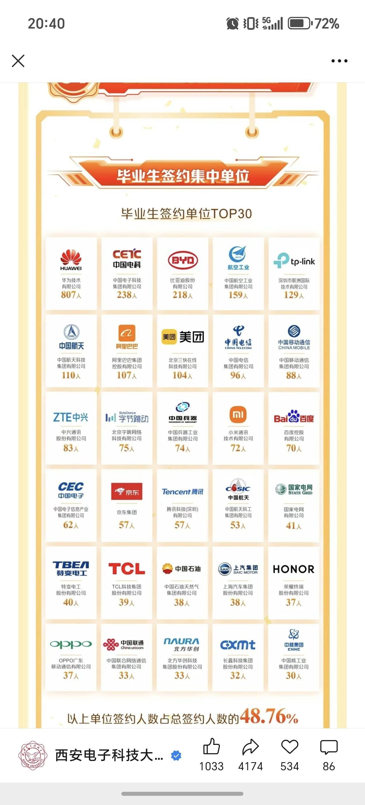 西电,西交大,华中科大,北邮发布了就业质量报告。 西电发布就业top30强单位,