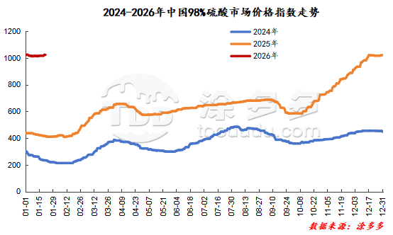 据涂多多数据测算,1月21日硫酸市场价格指数为1028.83,较昨日上调4.67,幅度为0.46%。