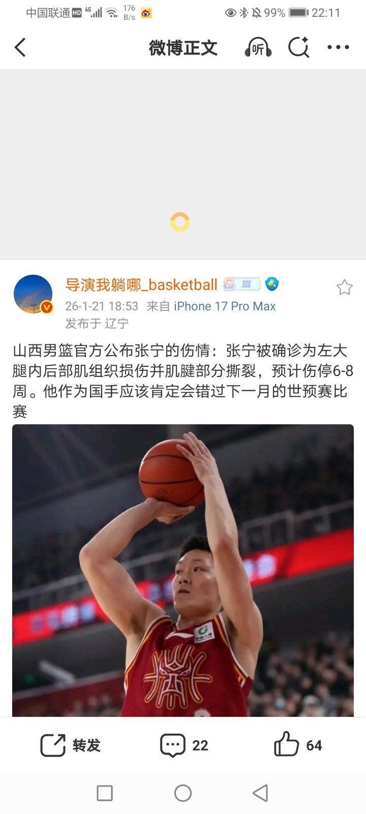 2026年1月22日-2025-2026CBA常规赛第18轮(第一阶段第18轮) 北控79-102浙江广厦(潜力赛:18-12)(卫冕冠军浙江广厦男篮获得七连胜/北控男篮遭遇两连败)/吉林98-119广东(广东男篮获得两连胜/吉林男篮遭遇两连败) 2025-2026WCBA常规赛A组第18轮(第一阶段第18轮) 陕西77-103山东(陕西女篮遭遇五连败 继续排名小组积分榜倒数第二)/新疆93-76大胜武汉(新疆女篮获得四连胜) 部分重点赛事预告:CCTV5直播:19:30 2025-2026CBA常规赛第18轮(第一阶段第18轮) *北京-浙江稠州 CCTV5+直播:CCTV5客户端直播:19:30 2025-2026CBA常规赛第18轮(第一阶段第18轮) *深圳-山西 19:00(2场)/20:00(2场) 2025-2026男排超级联赛第一阶段A级第11轮 北京-辽宁/浙江-广东/上海-山东/天津-河北 19:00(2场)/20:00 B级第12轮 河南-云南/福建-湖北/江苏-四川 其他:19:35/20:00 2025-2026CBA常规赛第18轮(第一阶段第18轮) 江苏-天津/新疆-四川 19:30(2场) 2025-2026WCBA常规赛A组第19轮(第一阶段第19轮) 浙江-江苏/四川-石家庄(河北) B组第18轮 厦门-江西