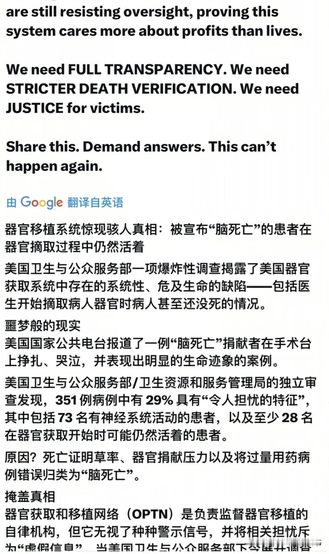 牢A跑路就对了,他已经触及到了美国资本的根本利益——器官捐献产业的潜规则。 请看美国新闻,一个当爹的,听到医生宣布儿子死亡,直接掏枪把重症监护室给封了,逼着医生继续抢救,结果是神奇的,人还真给救回来了! 这爹要是心里没点数,能这么拼命?说白了吧,器官捐献这行水太深。 美国新闻的报道中,摘器官的时候人还没死透的情况多了去了。早有卫生部独立调查扒出来,在他们统计的351个死亡病例里,73个还有神经系统活动,28个在器官被取的时候恐怕还活着,简直就匪夷所思。 为啥医生敢这么搞?因为“脑死亡”这三个字,操作空间太大了。没心跳能电击,没呼吸能按压,可一旦被宣布脑死亡,马上进入“取件模式”——这时候就算还有救,器官一摘,也就真没了。假死直接变真死。 大家对美国有滤镜,但是资本从来不相信眼泪,只看重利益。 美国医疗圈里都传:“取件模式”一开,钱就跟流水一样哗哗进来。很多医生背着几十万美元的学生贷,光靠工资哪够?取件可是有分成的。所以在某些医生眼里,躺着的哪是病人,根本就是摇钱树。 更惨的是亚洲人,尤其是来留学的。老美自己一堆嗑药垮掉的,身体不行,脑子也糊涂。亚洲留学生呢?身体健康、智商高、没啥不良嗜好——简直成了“优质货源”。 可笑的是,本土美国人根本不勾选器官捐献,而来美国的外国人总喜欢顺手一勾,以为献爱心。 但真相很残酷:你觉得这是奉献,在资本眼里,这就是一门买卖。