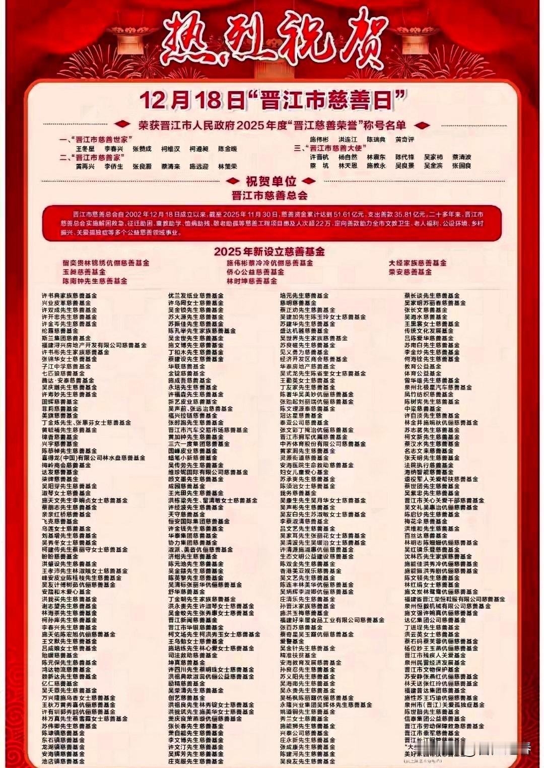 七星级慈善城市一一晋江市 2025年度 "晋江慈善荣誉″ 称号名单!