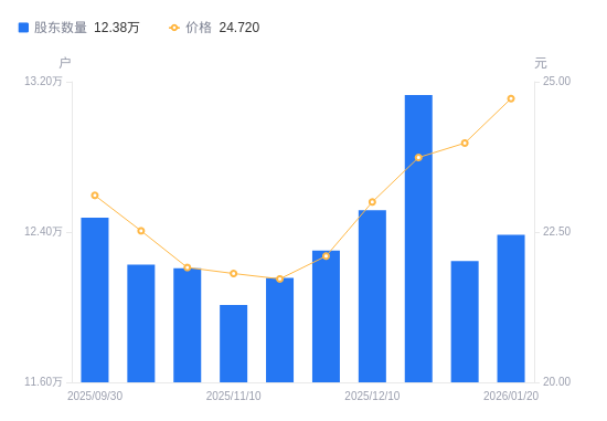 近一年(2025年1月20日至2026年1月20日),航天彩虹A股股东户数从9.57万户,增加至12.38万户,增幅29.38%,区间股价上涨39.74%。