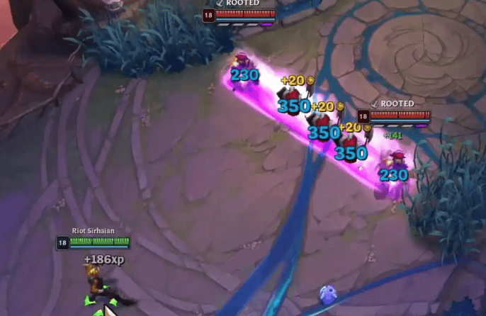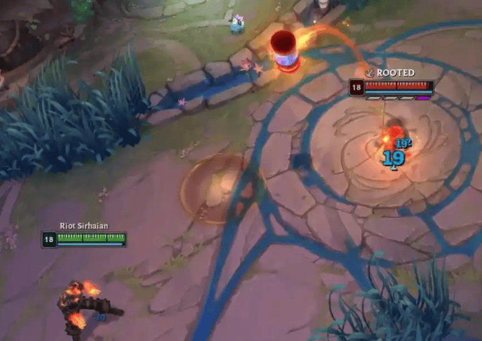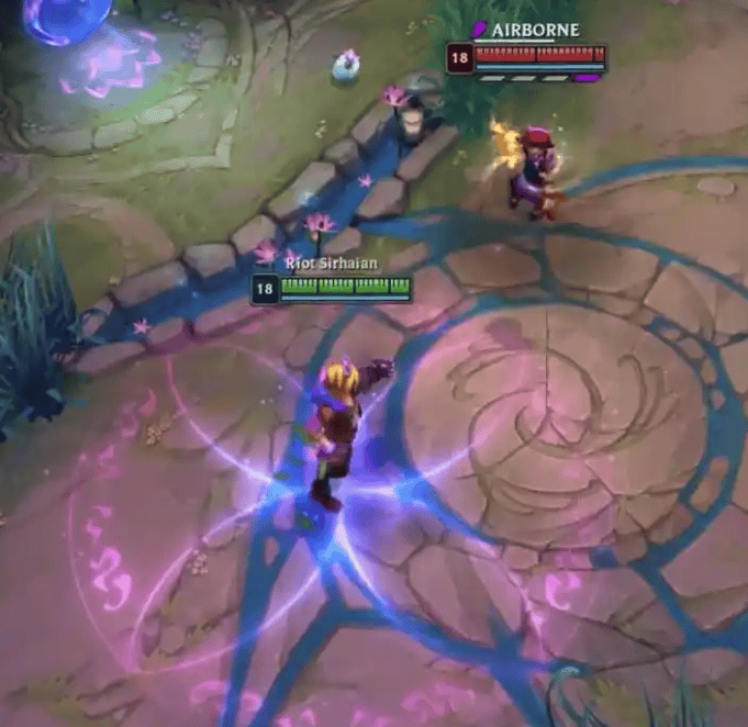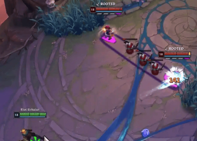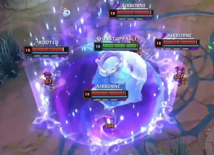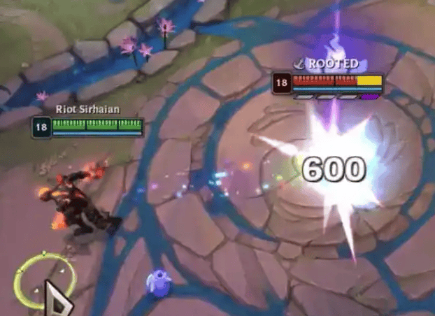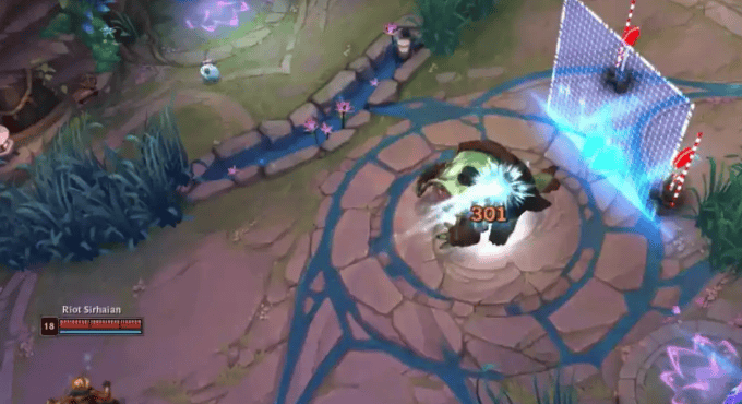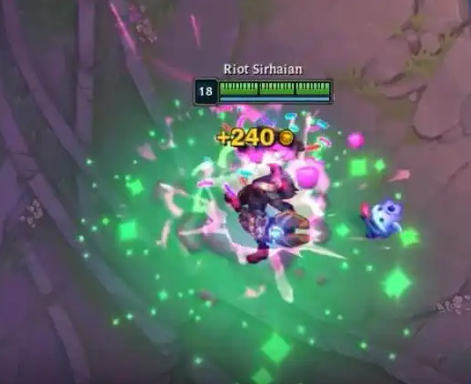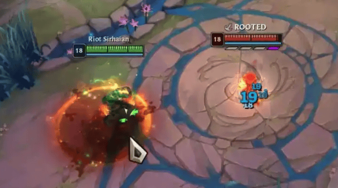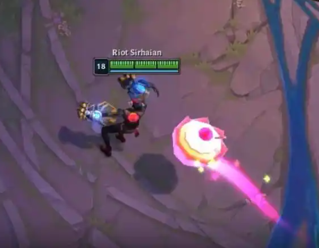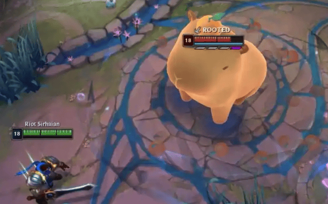 此外,魄罗王每秒会跃向空中并猛砸地面,对附近敌人造成100-300(+5%额外生命值)(+100%基础攻击力)(+50%法术强度)的物理伤害并将其击退。每次施法,魄罗王无法对同一敌人多次造成击退效果。