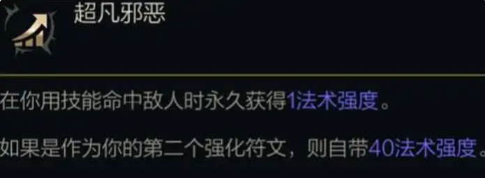 ·超凡邪恶:使用技能命中敌人后,永久获得1点法术强度。若该强化符文为你的第二个选择,将初始自带40点法术强度。