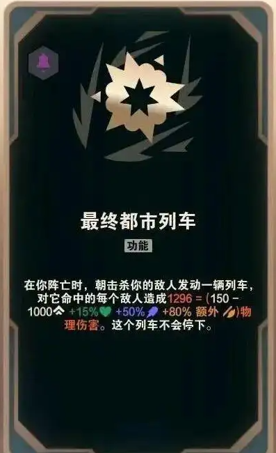 ·最终都市列车:你阵亡后,将向击杀者发射一列火车,对命中的敌人造成150-1000(+80%基础攻击力)(+50%法术强度)(+15%最大生命值)的物理伤害。(注:该效果将记录造成的伤害量、命中英雄次数及击杀英雄数量。)