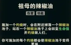 ·祖母的辣椒油:对敌人施加灼烧效果后,将在附近生成一片辣椒油区域,持续5秒。