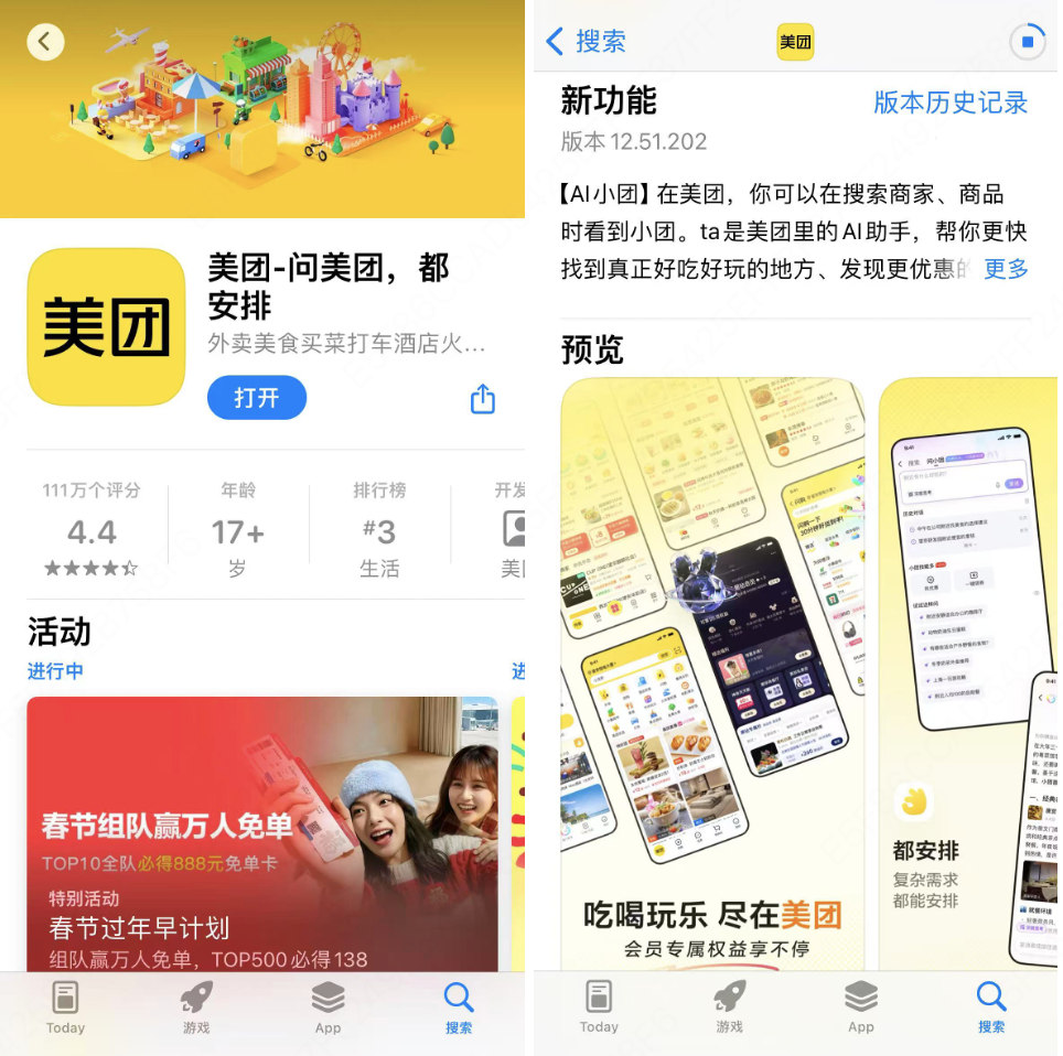1月22日,据iOS应用商城信息显示,美团App升级到了12.51.202版本,新版本上线“问小团”AI搜索功能,用户在美团搜索商家、商品时使用此功能,即可更便捷找到吃喝玩乐好去处、发现更优惠的商品和服务信息。