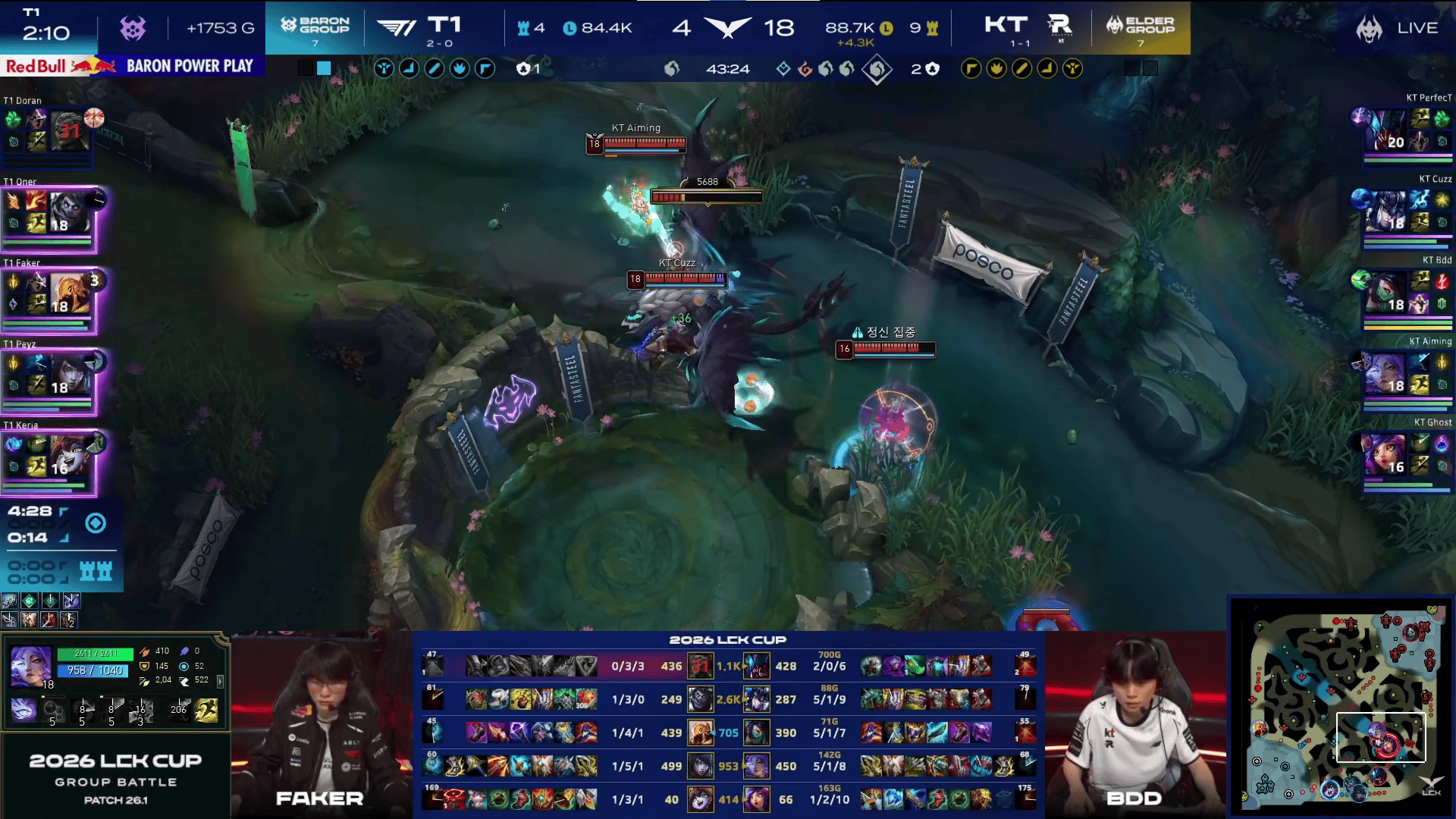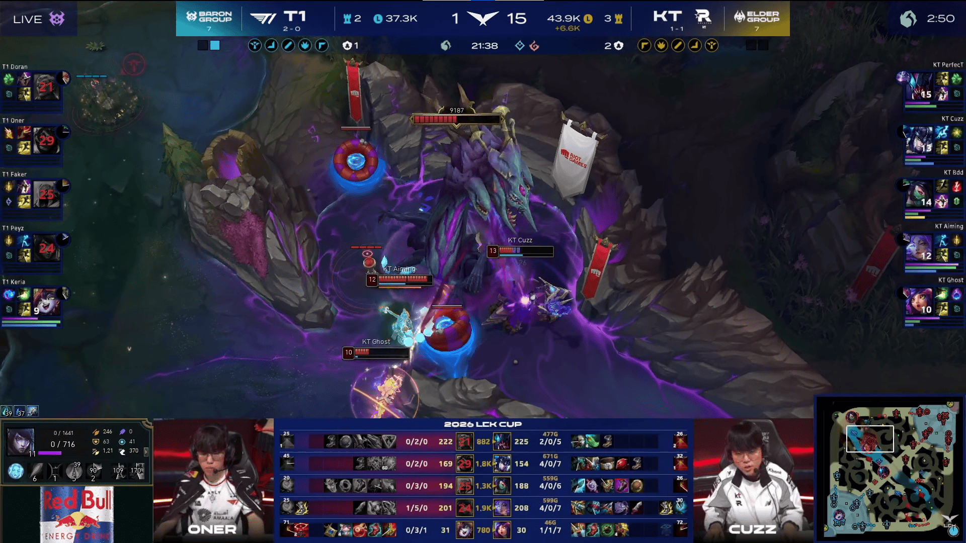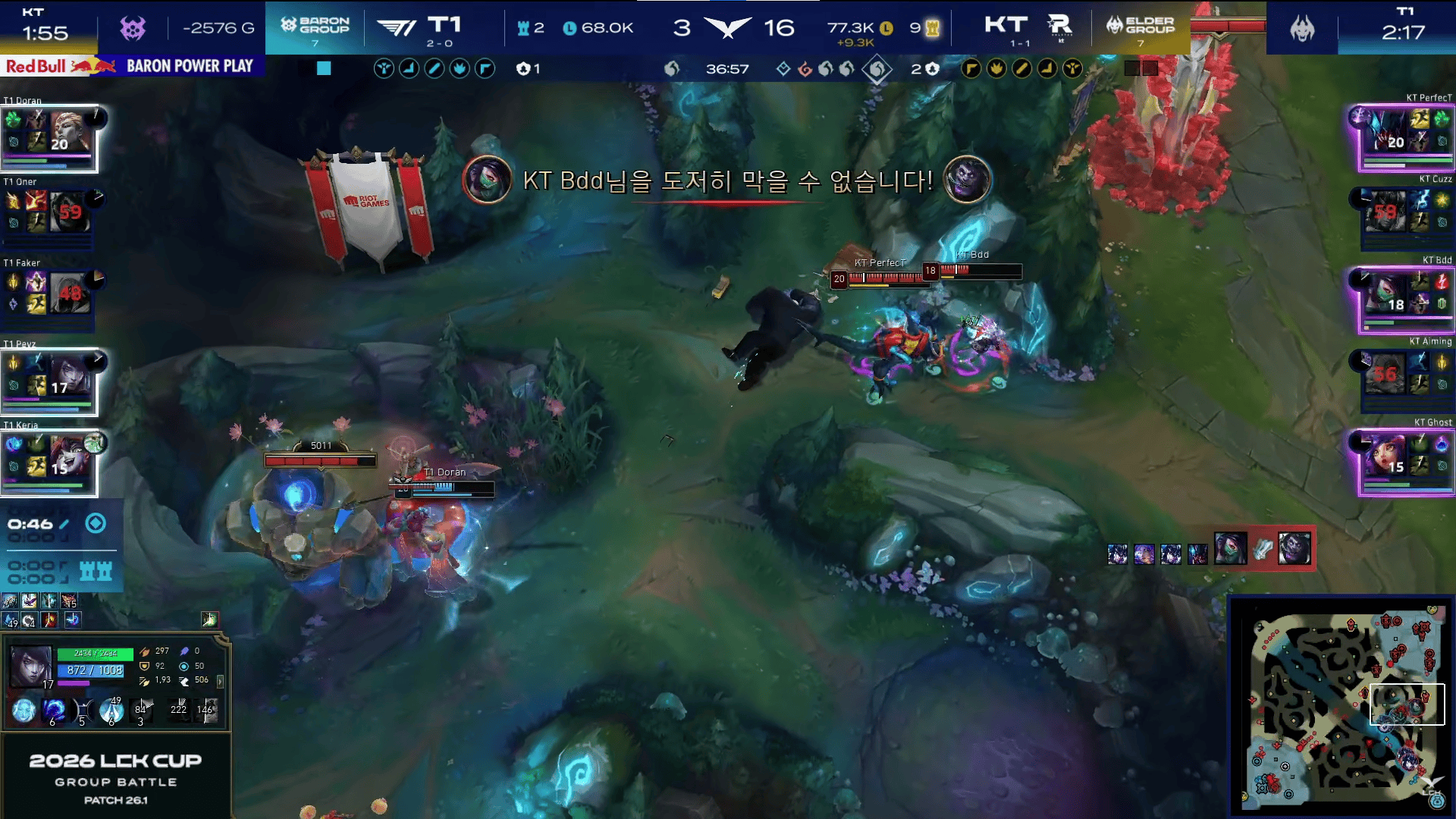 比赛第15分钟,Bdd阿卡丽抓掉T1下路双人后KT前期打出7-1的领先。