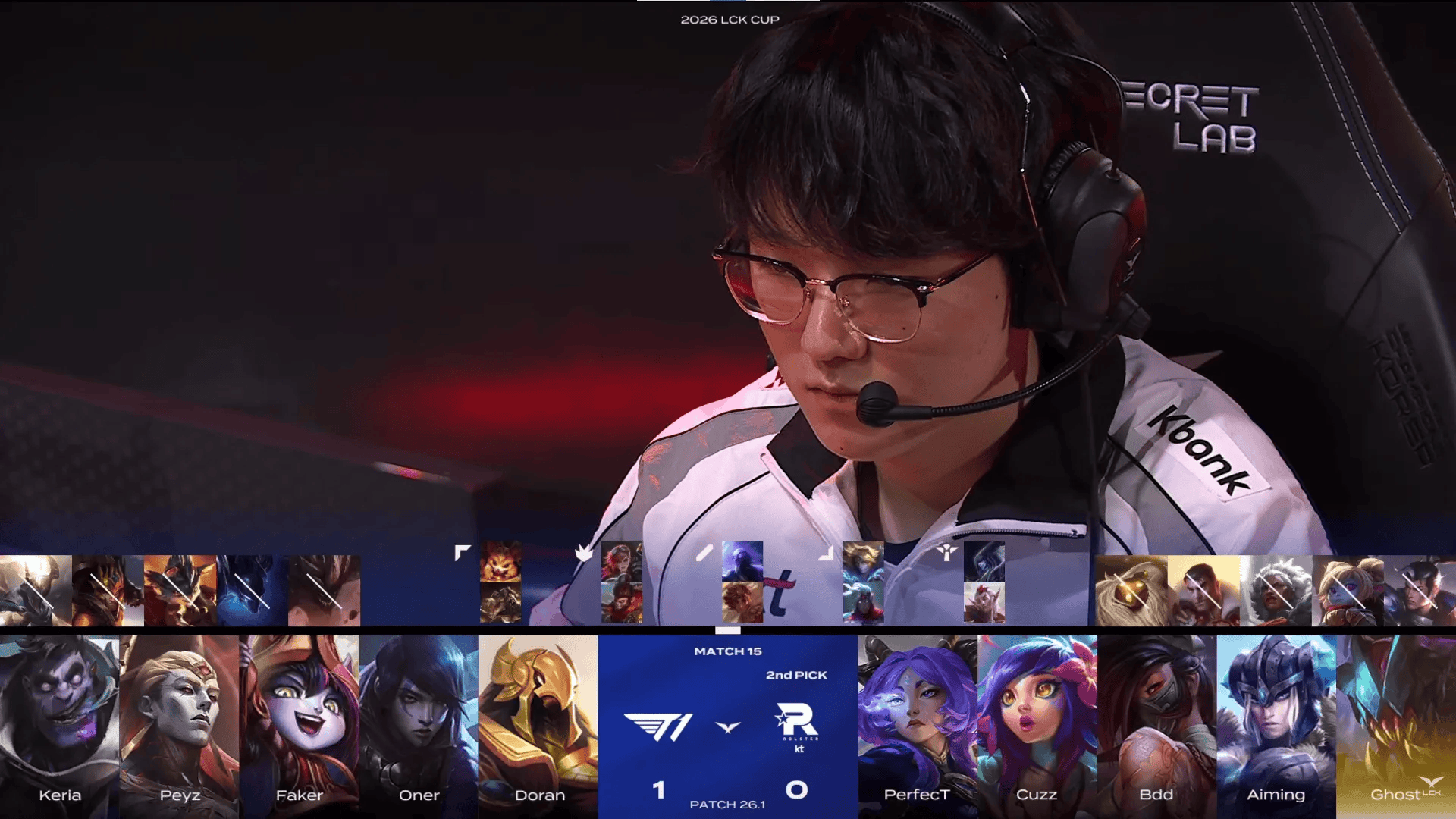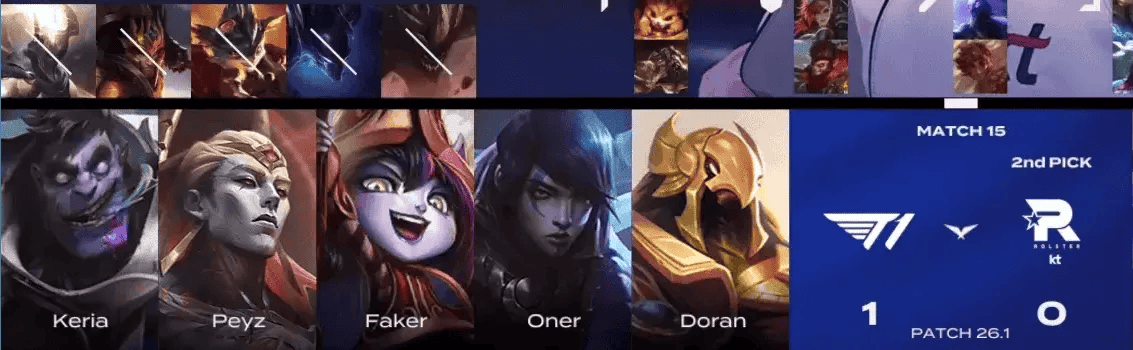 T1选用:Doran亚恒、Oner蒙多、Faker沙皇、Peyz厄斐琉斯、Keria璐璐