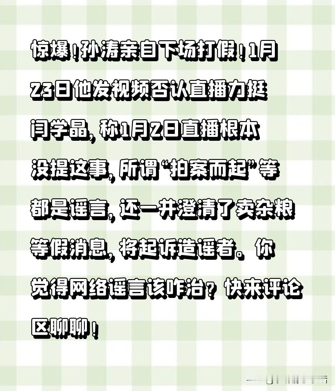 惊爆!孙涛亲自下场打假!1月23日他发视频否认直播力挺闫学晶,称1月2日直播根本没提这事,所谓“拍案而起”等都是谣言,还一并澄清了卖杂粮等假消息,将起诉造谣者。 你觉得网络谣言该咋治?快来评论区聊聊!