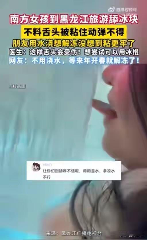 南方姑娘去黑龙江舔冰砖,舌头粘死拔不动!朋友浇水反而坑惨她 南方小土豆去东北可别乱舔冰啊!就有位姑娘亲身踩了坑,好奇舔了口户外的冰砖,舌头直接粘得死死的,朋友好心浇水想解冻,结果反倒让粘得更牢了,俩人当场都慌了。 这事就发生在最近,一位南方姑娘特意去黑龙江玩,看着当地随处可见的厚冰砖觉得新鲜得很,一时手贱嘴也馋,伸出舌头就舔了一下。谁能想到东北零下的温度这么厉害,舌尖刚碰到冰砖的瞬间,直接就被粘住了,怎么扯都扯不动,姑娘当时急得脸都白了。 同行的朋友看到这情况也手忙脚乱,脑子一热想着用水浇一浇,冰化了舌头不就下来了,赶紧找水往冰砖和舌头粘住的地方淋。可万万没想到,冷水浇上去不仅没把冰化开,反倒因为外头太冷,水一下子就冻住了,直接把舌头粘得更紧了,俩人这下是真没辙了,站在原地干着急。 还好最后姑娘和朋友琢磨出了正确的法子,对着粘住的地方一个劲哈热气,用自己的体温慢慢把冰层化开,舌头这才终于脱离了冰砖,万幸的是没咋受伤。这事被说出来后,不少网友都忍不住调侃,有人说“不用救,等开春天暖了自然就解冻了”,还有东北网友出来说,这都是北方孩子从小就知道的坑,根本没人敢碰。 针对这事,医生也特意给了提醒,说要是真遇上舌头粘冰的情况,千万别硬扯,也别随便用温水猛浇,很容易把舌头弄伤。要是实在想体验舌尖碰冰的感觉,不如吃根冰棍,既安全,也能过过瘾。 其实每年冬天东北冰雪季,都能碰到好几起游客舔冰、舔铁栏杆被粘住的事,景区工作人员也天天在旁边劝,可总有人好奇。眼下正是去东北玩的旺季,好多南方游客都去北方感受冰雪乐趣,也提醒大家,玩归玩,可一定要注意安全,别因为一时好奇,让好好的旅途添了麻烦。