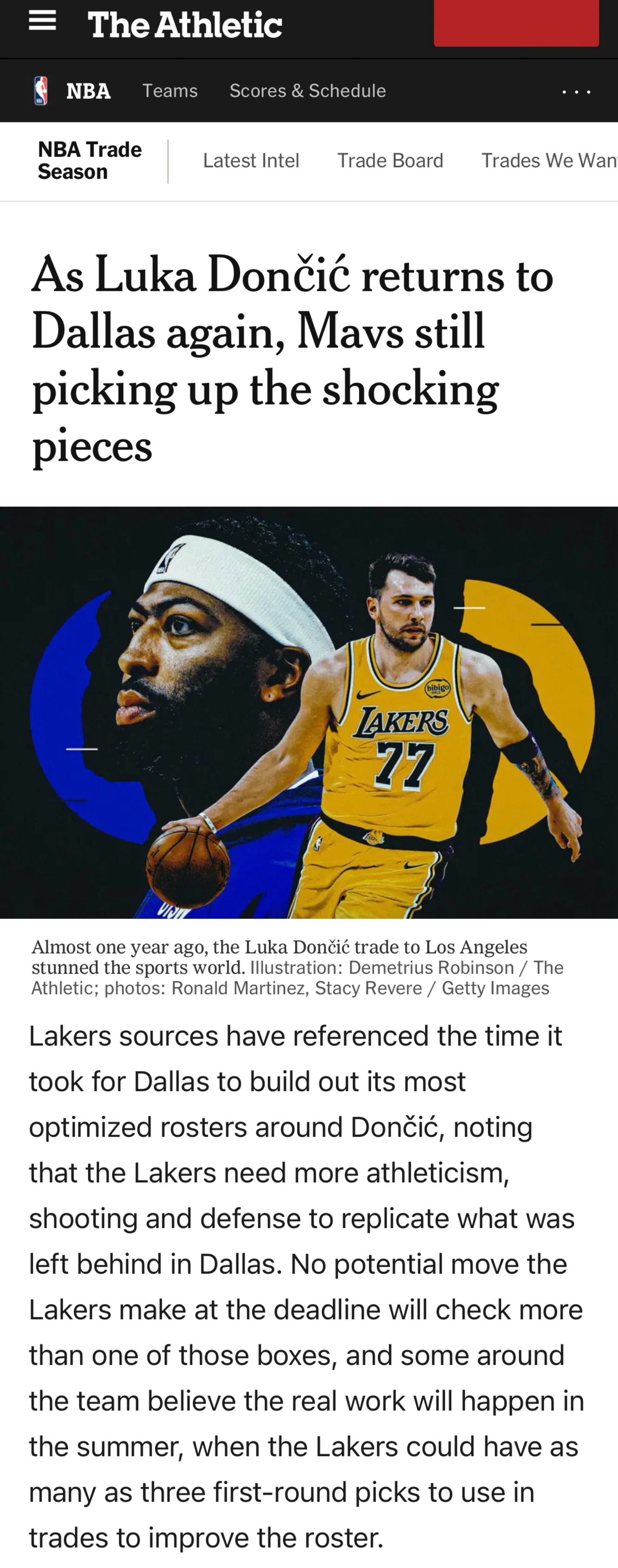 The Athletic 记者ChristianClark & DanWoike联合报道:湖人消息人士提到,达拉斯当年围绕东契奇打造出最适配阵容也花了不少时间,并指出湖人需要补充更多运动能力、投射和防守,才能复刻东契奇在达拉斯时期的成功。在本次交易截止日前,湖人的任何潜在操作最多只能满足上述一项需求,因此球队内部认为,真正的阵容升级将在今夏完成——届时湖人最多可手握三个首轮签,用于交易补强阵容。
