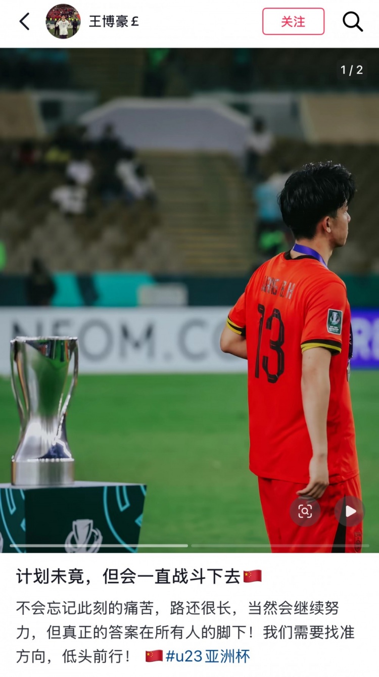直播吧1月25日讯U23亚洲杯决赛,U23国足0-4不敌日本U23,夺得赛事亚军。赛后替补出战的王博豪更新社媒,表达了对失利的遗憾。