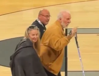 2026年1月25日,前马刺队主教练格雷格-波波维奇拄着拐杖出现在球场。现场球迷瞬间起立,掌声穿越球场喧嚣,久久未曾停歇。