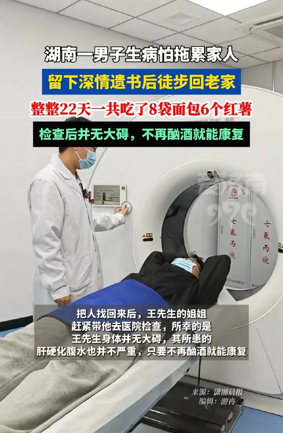 湖南,46岁男子查出肝病,为了不连累家人,他写了一封遗书交代了身后之事,就离家出走。这一举动吓坏了家人,他们赶紧报警,等找到男子子时,他已经独自走了22天,靠吃面包和红薯度日,不料,等他再去检查身体,结果却让家里人喜极而泣。 据悉,46岁的王先生生平酗酒,平时一日三餐总是酒不离手。 就连他吃早餐,就着咸菜能喝二两白酒,中午晚上更是顿顿少不了酒,啤酒、白酒换着来。 他经常挂在嘴边一句就是:这酒比饭还重要。 家属看在眼里急在心里,妻子、父母、孩子轮番劝他少喝点,别拿身体当儿戏。 不要觉得年轻没事,等老了一身病,遭罪的还是你自己,还有这个家。 但王先生总是这些话当成耳边风,左边进,右边出。他嘴上随口应着:知道了,下次少喝。 可是转头依旧端起酒杯,喝得酩酊大醉,次数多了,家人也只能无奈叹气,却始终没有放弃劝说。 王先生的酒量没减,身体却渐渐有了异样,偶尔会觉得肝区隐隐作痛,胃口也变差了。 可他总以为是酒喝多了的正常反应,揉一揉、忍一忍就过去了,从没放在心上。 直到2024年的一天,王先生喝完酒后突然觉得肝区剧痛,疼得直不起腰,连站都站不稳,冷汗瞬间浸湿了衣服。 在家人的搀扶下,他才第一次主动踏进了医院的大门,心里却还抱着一丝只是小毛病的侥幸。 这一检查,让他和家属惊出一身冷汗。 医生称,王先生的肝脏已经出现了明显损伤,确诊为严重肝炎,后续不仅需要长期治疗,花费不菲,还得立刻戒酒,配合药物调理,稍有不慎,病情就会继续恶化,甚至发展成更严重的肝病。 这病要想治愈,不仅要花不少钱,后续还得专人照顾,忌口、复查一样都不能少,但凡再沾一滴酒,之前的努力全白费。 医生的话字字句句砸在王先生心上,让他惊出一身冷汗。 家属们的心也跟着揪起来,他们不让王先生工作了,让他在家休息,还严禁他喝酒。 王先生于是在家安心养好身体,按时去医院看病复查。 2025年底,王先生看着手里的报告单,想到家里本就不宽裕的经济状况,想到妻子平时省吃俭用,想到孩子还在上学,父母年事已高。 他脑海里还回想着医生说的那句话:花钱多,要照顾几个字。 若是自己真的长期卧病,不仅要花光家里的积蓄,还得让一家人围着自己操劳,拖垮整个家。 王先生越想越愧疚,越想越觉得自己是家人的累赘,一个极端的念头在他心里渐渐萌生:不如离开,这样就不会连累家人了。 于是他连夜给妻子写了一封遗书,字里行间满是愧疚,交代了自己的身后事,叮嘱家人好好生活,不要为他担心,也不要找他。 等家人发现遗书后,担惊受怕的他们以为王先生会想不开,于是报警寻人。 在这漫长的22天,王先生的家属过得无比煎熬。 经过一番折腾,总算找到了憔悴消瘦、满身疲惫的王先生。 这22天里,他就靠着好心人给他的8袋面包和6个红薯度日,直到家里人找到他。 一家人相拥而泣,妻子又心疼又气愤,他们商量着,不管花多少钱,一定要把王先生的病治好。 他们第一时间带着王先生赶往医院,重新做了全面的检查。 让家人们喜极而泣的是,这次的检查身体没大碍了,或许是王先生远离了酒,身体竟然好转了,只要不喝酒,就可以康复了。 王先生经过此事,也觉得身体健康比什么都重要,也感谢家人对他不离不弃。 《民法典》第1050条规定,自然人的生命权、身体权、健康权处于危难情形的,负有法定救助义务的组织或者个人应当及时施救 。 如果家人在王先生有救治希望的情况下,拒不履行救助义务,放任其病情恶化,便可能涉嫌侵害其生命健康权,需承担相应的法律责任。 《民法典》第1059条规定,夫妻有相互扶养的义务,需要扶养的一方,在另一方不履行扶养义务时,有要求其给付扶养费的权利 。 王先生和妻子婚姻关系存续,他因患病、丧失劳动能力等需要扶养,而他妻子具备扶养能力,就必须履行照料、支付医疗费用等扶养义务。 王先生的家人不仅是血脉相连的亲人,更是法律规定中彼此的依靠,在患病危难时,互相照料、共渡难关,不仅是亲情,更是不容推卸的法律责任。 对此,你怎么看?