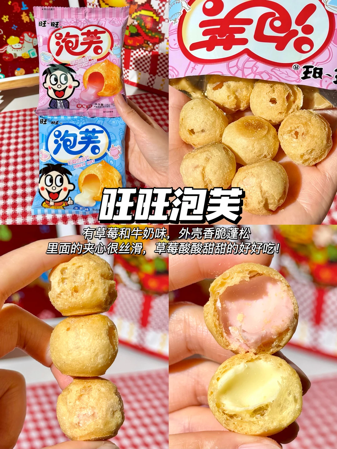✅旺旺泡芙:有草莓和牛奶味,外壳香脆蓬松,里面的夹心很丝滑,草莓酸酸甜甜的好好吃!