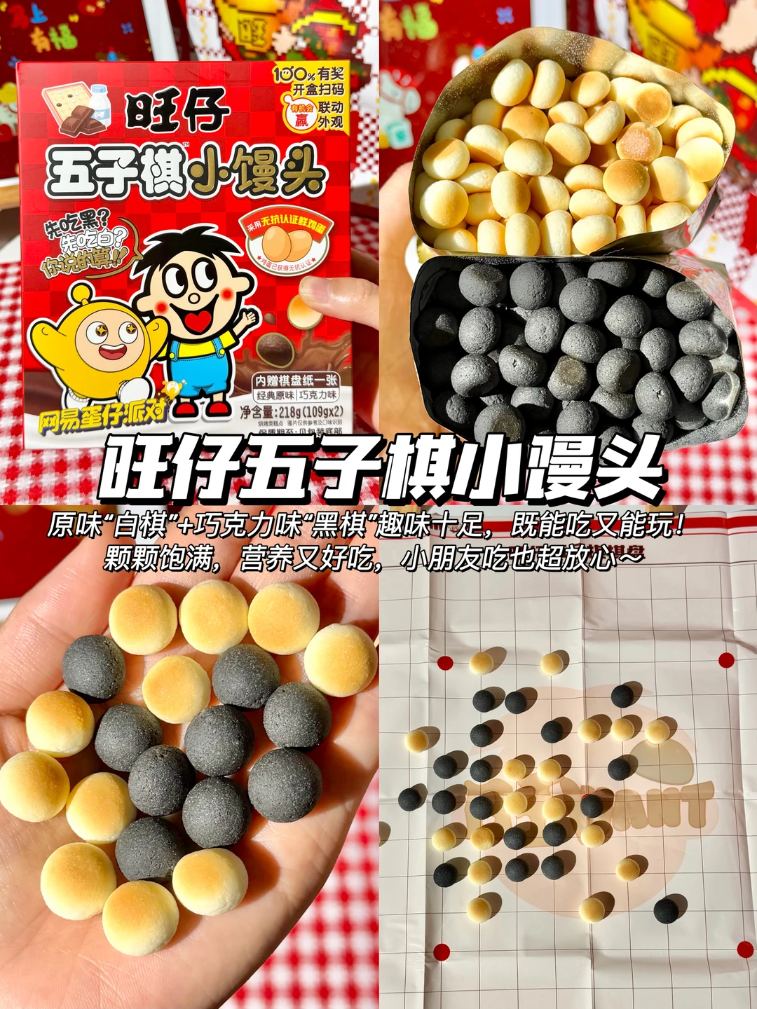 ✅旺仔五子棋小馒头:原味“白棋”+巧克力味“黑棋”趣味十足,既能吃又能玩!颗颗饱满,营养又好吃,小朋友吃也超放心~