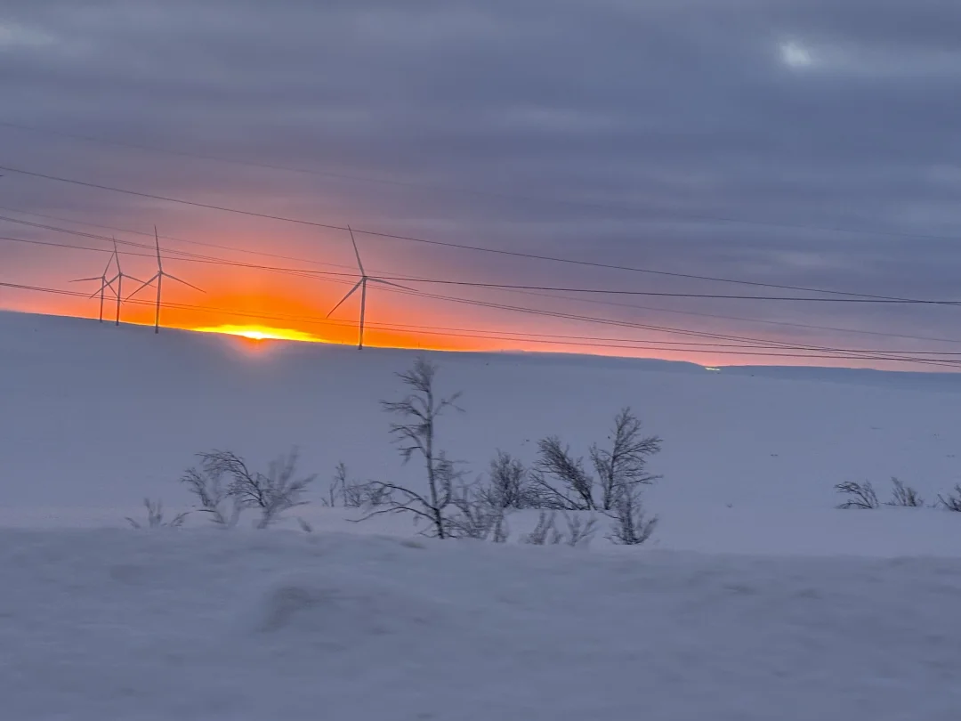 霞光穿透云层,洒在覆满厚雪的荒原与冰原上,连凛冽的寒风都被揉进了暖意。沿途雪凇裹着霞光,在车窗外交替掠过,天地间只剩纯粹的白与温柔的金,美得让人失语,只想静静珍藏这份不期而遇的幸运。