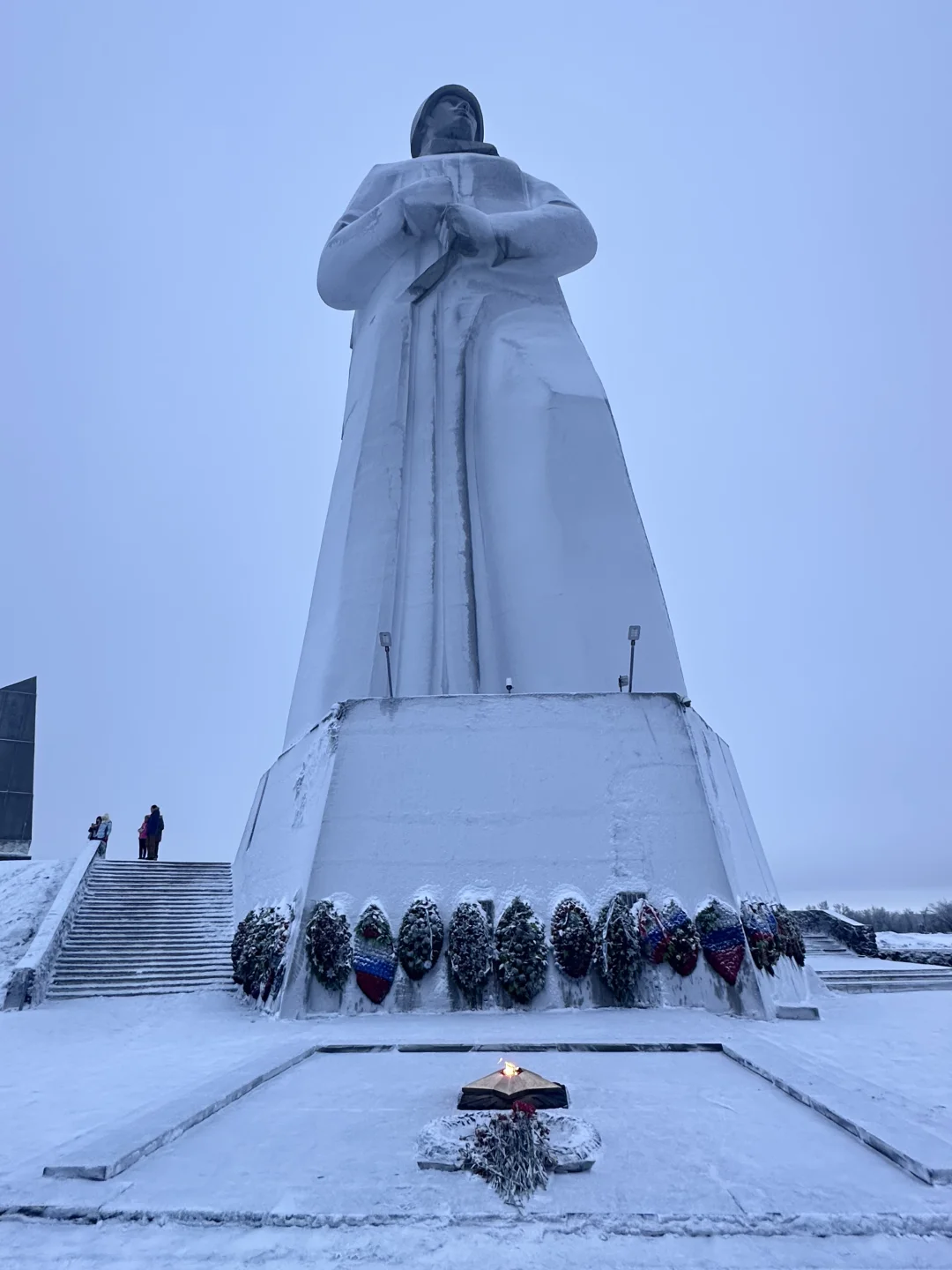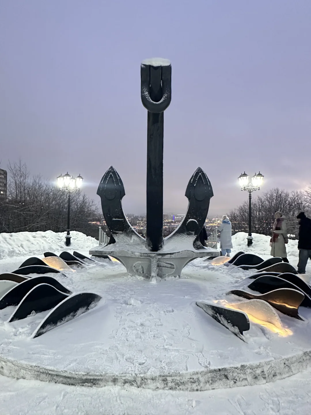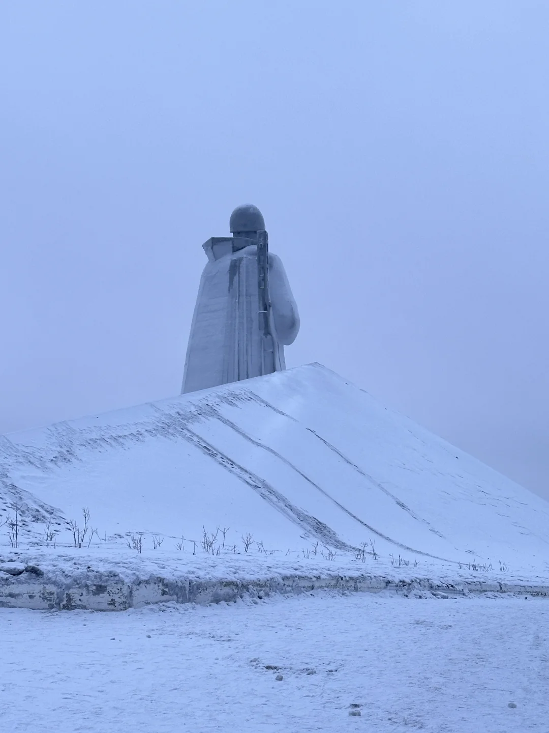 先登上阿廖沙纪念碑,站在城市至高点的广场上,俯瞰整座摩尔曼斯克。这座象征着勇气与坚守的雕像,在冬日的晴空下格外庄严,远处北冰洋的波光与城市的红顶建筑相映,构成了独属于北极的冬日画卷。