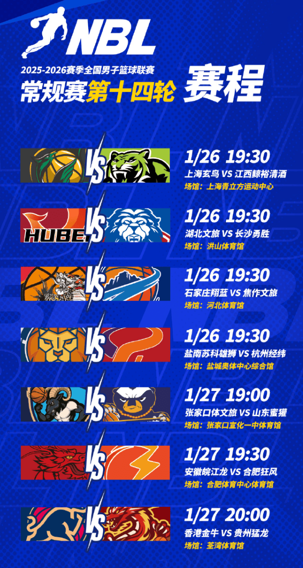虎扑01月26日讯NBL分享常规赛第14轮赛程:香港金牛将对阵贵州猛龙。