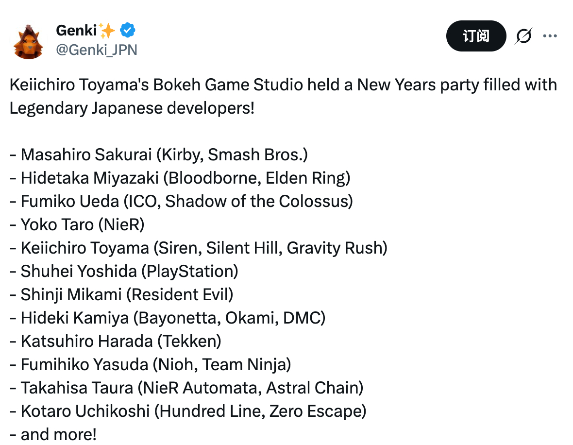 【日本游戏圈大佬聚会合照公开,你认识几位?】游戏制作人外山圭一郎在社交媒体上晒出了日本游戏圈大佬聚会的合照,并解释由于小牟田修提前离开而未能拍上集体照(右上角有P图照)。游戏博主Genki列举了出现的众多日本知名游戏制作人:- 樱井政博(星之卡比、任天堂明星大乱斗)- 宫崎英高(血源诅咒、艾尔登法环)- 上田文人(ICO、旺达与巨像)- 横尾太郎(尼尔)- 外山圭一郎(死魂曲、寂静岭、重力眩晕)- 吉田修平 (PlayStation)- 三上真司(生化危机)- 神谷英树(猎天使魔女、大神、鬼泣)- 原田胜宏(铁拳)- 安田文彦(仁王、Team Ninja)- 田浦贵久(尼尔:机械纪元、异界锁链)- 打越钢太郎(百日战纪、极限脱出)还有更多!