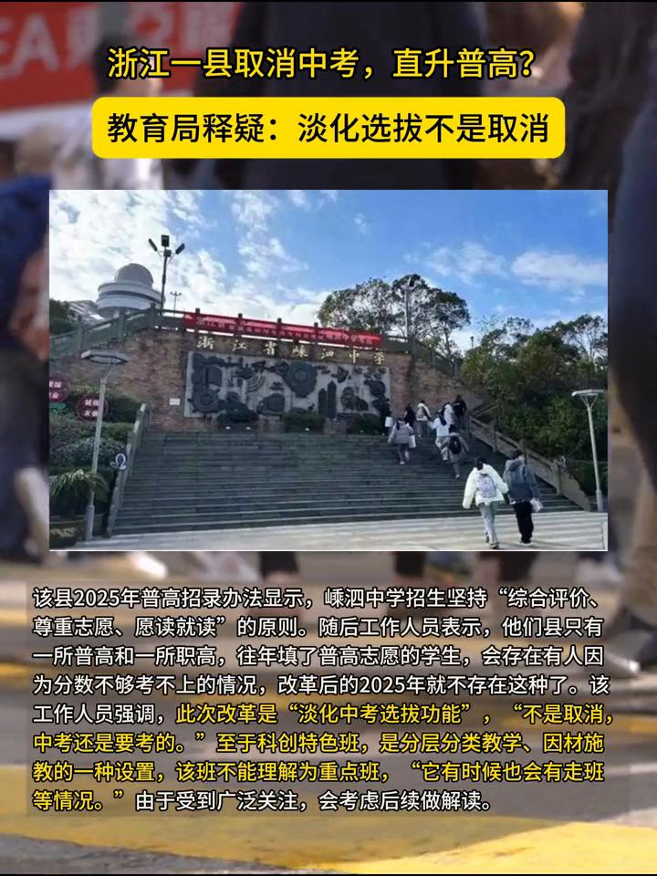 浙江一县取消中考,直升普高?教育局释疑:淡化选拔不是取消。 1月22日,嵊泗县教育局发文《嵊泗县取消中考选拔功能实现普高"全员直升"》。文章介绍,该县立足实际进行中考制度改革,工作人员强调,此次改革是"淡化中考选拔功能","不是取消机制。"自2025年秋季学期起,全面取消普通高中录取分数线门槛,确保本县户籍及符合条件的随迁子女初中毕业生100%能够升入普通高中,2025学年全县266名填报普高的初三毕业生全部录取,实现"愿读尽读",县域普高就读率达81%。 该县2025年普高招录办法显示,嵊泗中学招生坚持"综合评价、尊重志愿、愿读就读"的原则。随后工作人员表示,他们县只有一所普高和一所职高,往年填了普高志愿的学生,会存在有人因为分数不够考不上的情况,改革后的2025年就不存在这种了。该中考还是要考的。"至于科创特色班,是分层分类教学、因材施教的一种设置,该班不能理解为重点班,"它有时候也会有走班等情况。"由于受到广泛关注,会考虑后续做解读。