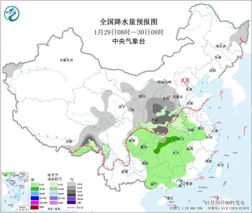 1月30日:白天阴有小雨到中雨,夜里阴有小雨或雨夹雪,东北风4~5级阵风6级,3~5℃;