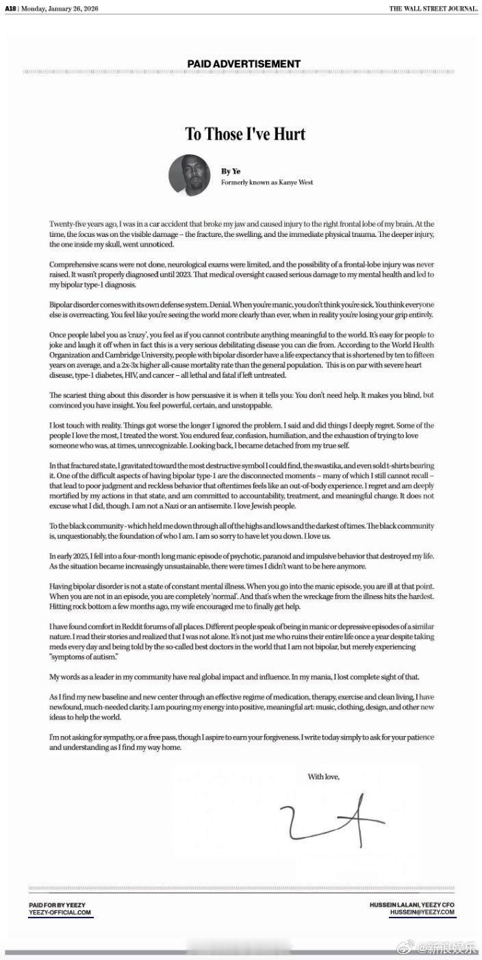 侃爷登报道歉 26日,侃爷Kanye West登报道歉,标题为《致我伤害过的人们》,他表示过去自己做的种种争议行为,是因为25年前发生车祸导致额叶受伤,对他的心理健康造成了严重影响,最终确诊为双相情感障碍。如今,在有效的药物治疗、心理治疗、运动和健康生活方式的帮助下,他获得了清醒,正投入到积极有意义的创作中。YE又想干啥了?
