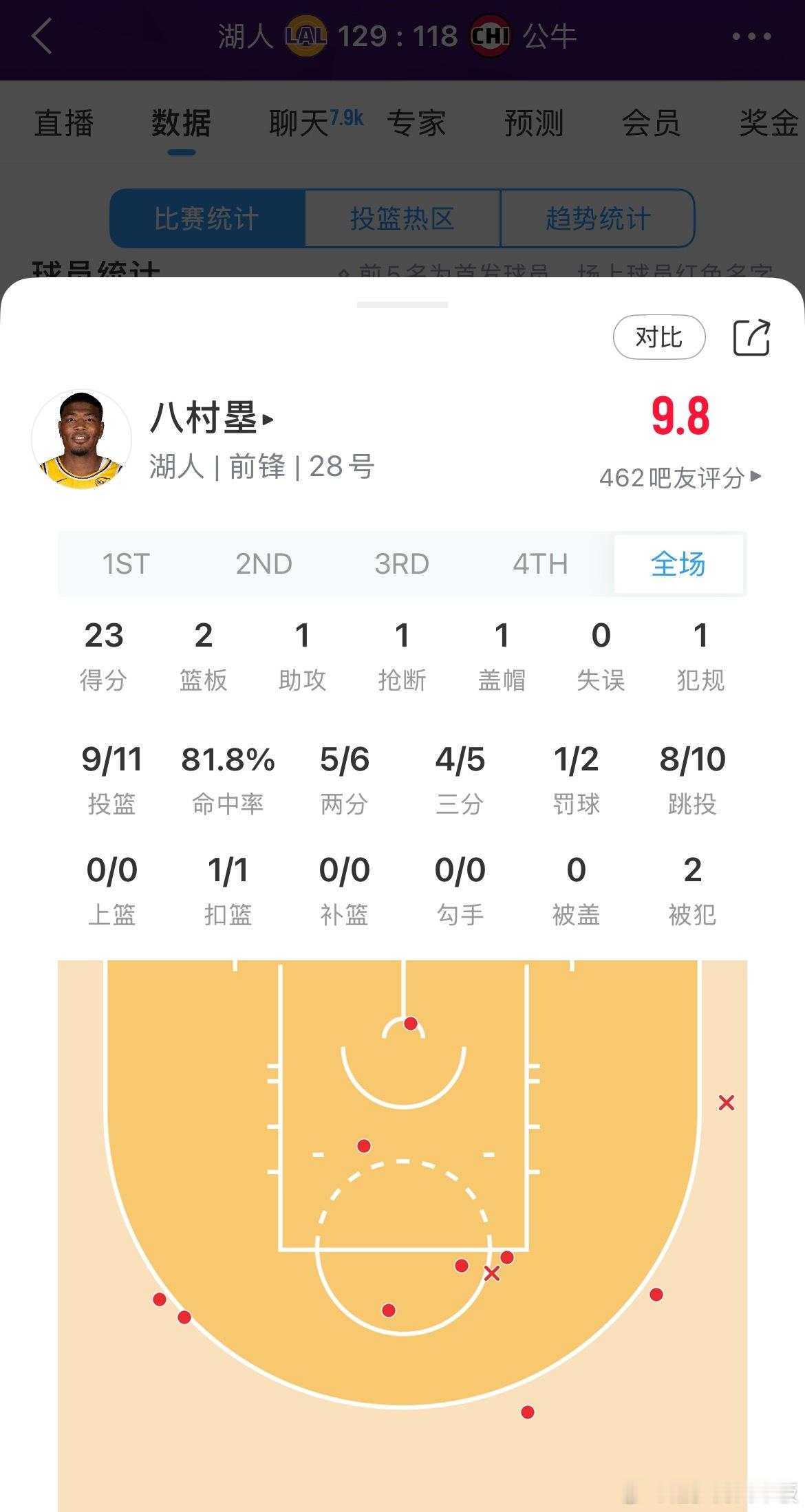 八村塁手感火热,替补11中9砍下23分!正负值+22湖人vs公牛