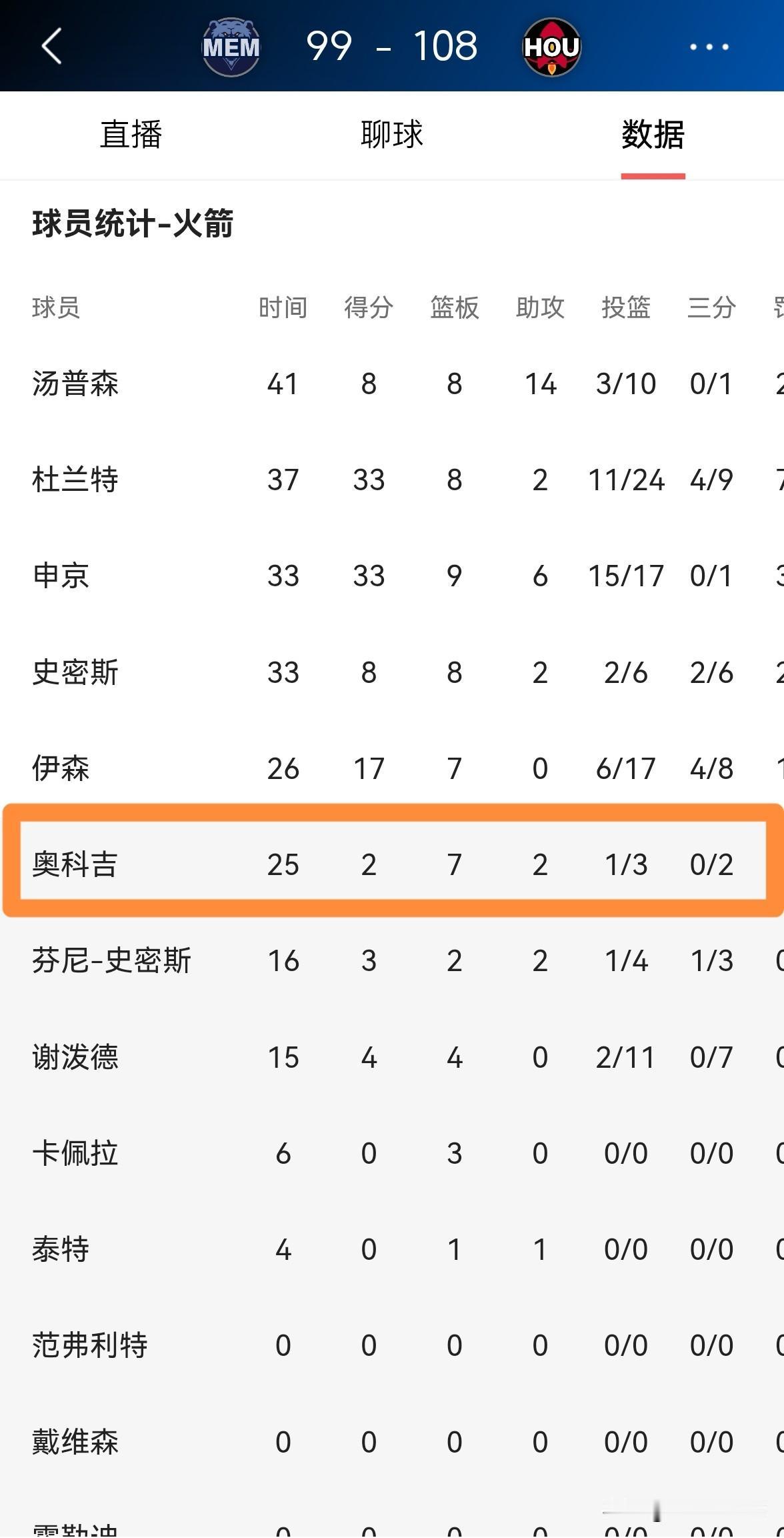 我必须要称赞一下火箭悍将奥科吉的拼劲!在今天火箭主场以108:99战胜灰熊的比赛中,奥科吉在场上拼劲十足,尤其是在防守端和拼抢前场篮板方面更是充满了积极性。 整场比赛下来,奥科吉替补出战25分钟,投篮3中1得到2分,不过有7篮板2助攻1抢断,其中包括2个前场篮板,没有出现任何的失误,他的场上正负值为+7。 试问像奥科吉这种既便宜又好用的球员,哪位主教练不喜欢呢?
