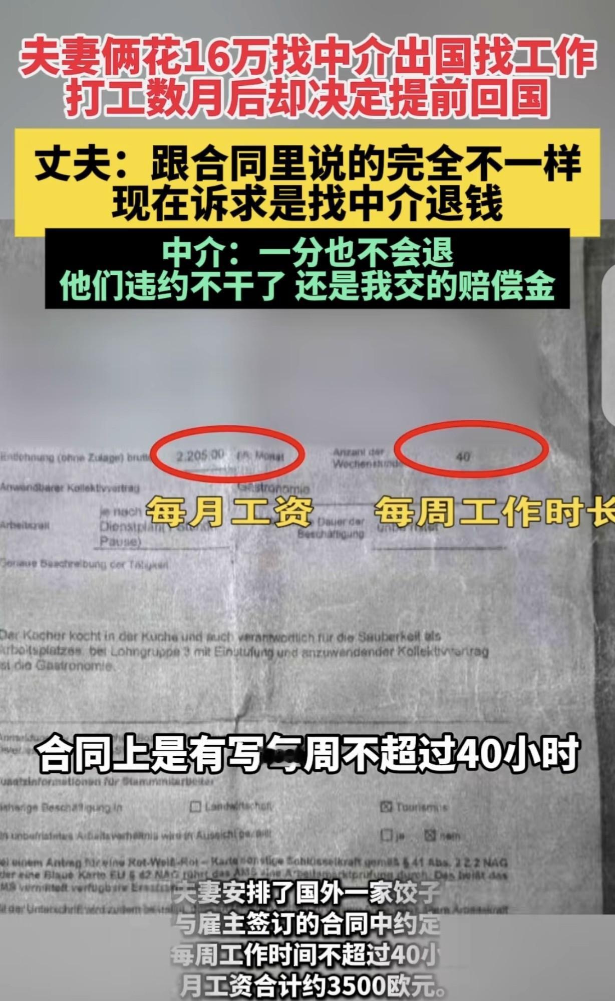 三明夫妻交16万出国打工, 合同写3500欧月薪却天天干到凌晨, 人还在奥地利,钱还能要回来吗? 阿强和老婆在三明老家攒了半辈子钱,掏16万找中介去奥地利包吃住打工。 合同白纸黑字写着“每周不超40小时、月薪3500欧元”,结果到地方第一天,工厂老板让他们早上8点干到晚上12点,没加班费,连休息日都被取消。 中介说“通勤3小时不算工时”,可欧盟法律早规定40小时包含实际工作时间,超时必须付钱。 他们想投诉,但手机里连张打卡截图都没有,奥地利小厂压根不用打卡机。 商务部去年抽查过几百份劳务合同,六成以上没写清楚怎么算违约、出了事找谁赔。 有人签完才发现,雇主公司根本没在奥地利劳工局备案。 阿强发微信问中介退点钱,对方回:“证办了,人送到了,我们没违约。” 合同上写的字,跟实际干的活,根本不是一回事。 人还在国外,钱已经没了。