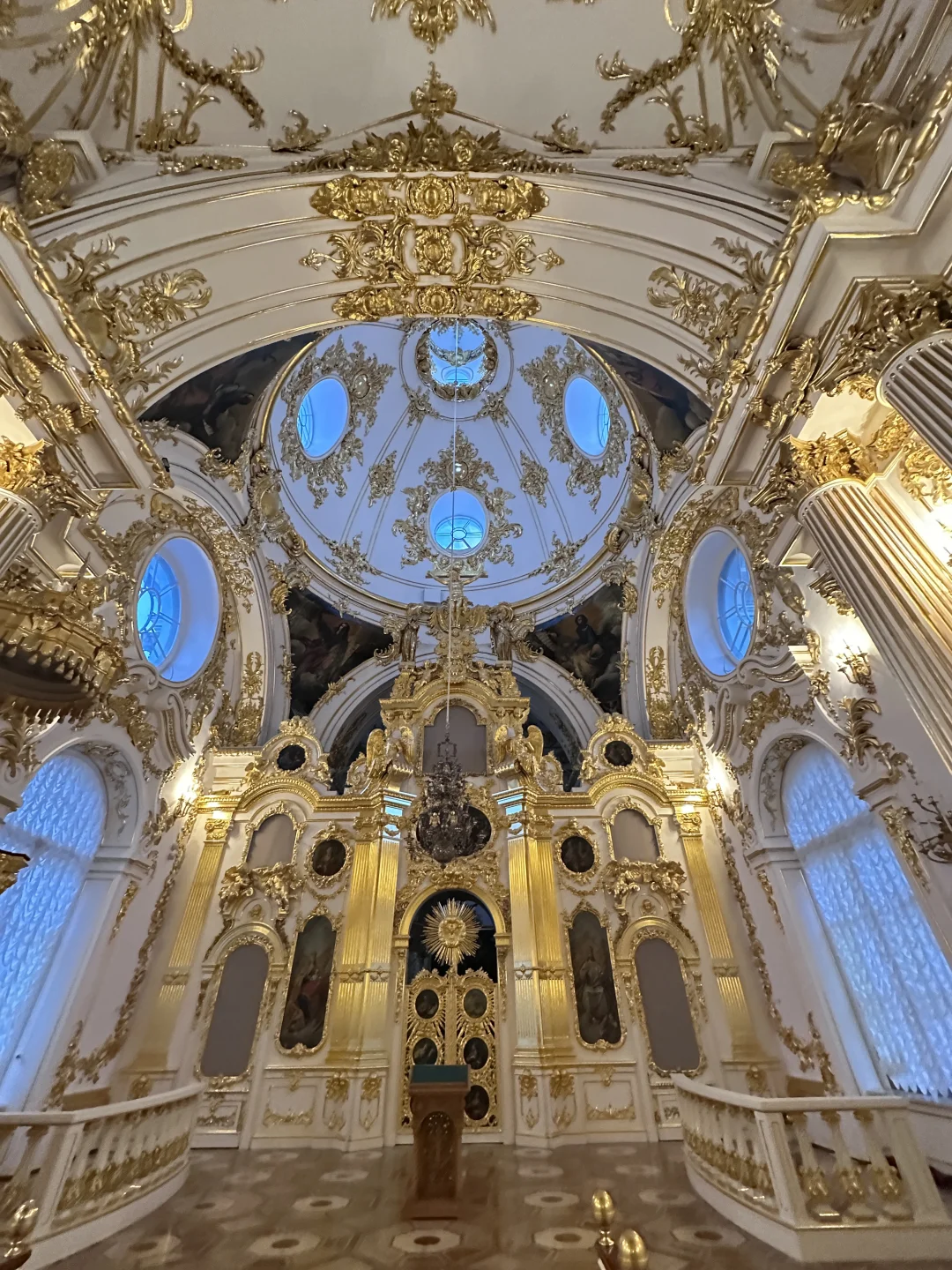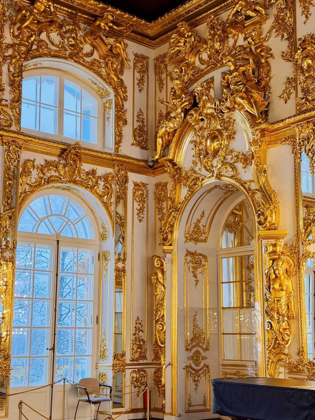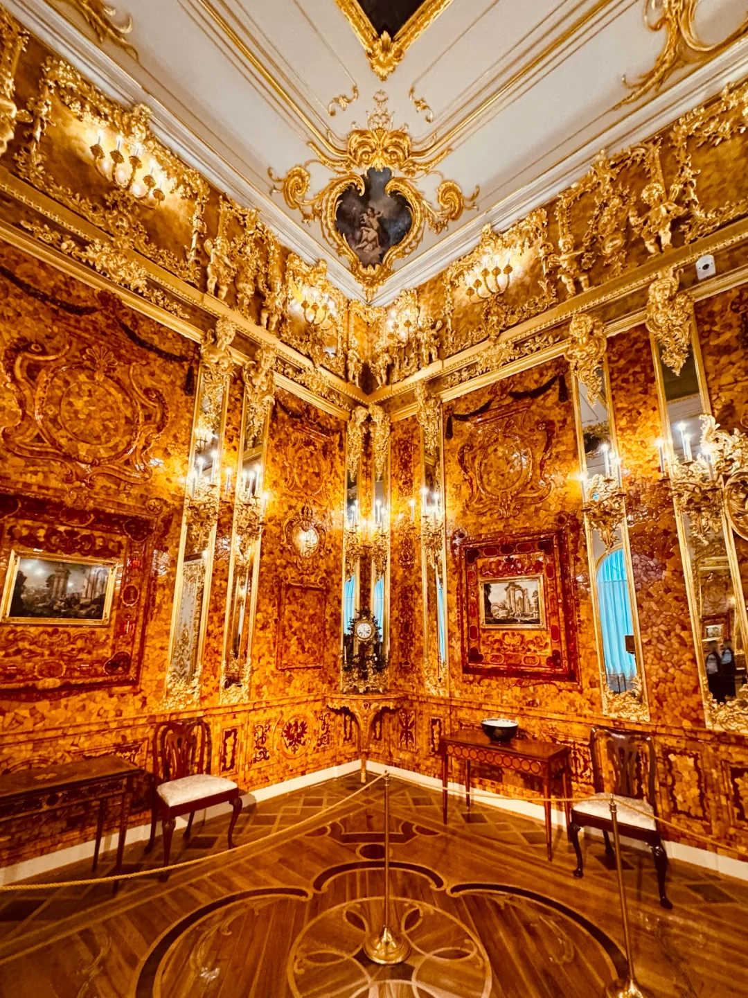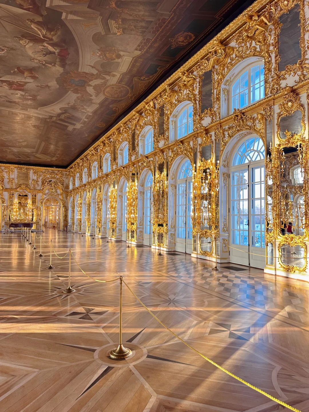 但真正的震撼是琥珀厅!六吨多琥珀+黄金镶嵌的墙面,光影流转间从柠檬黄晕染到金红,暖光像有魔力一样让人移不开眼,不愧是“世界第八大奇迹”!领队请的讲解超会说,从伊丽莎白女皇的扩建故事讲到卫国战争后的重建历程,让这份奢华多了历史的厚重感,瞬间读懂俄式浪漫与气派~