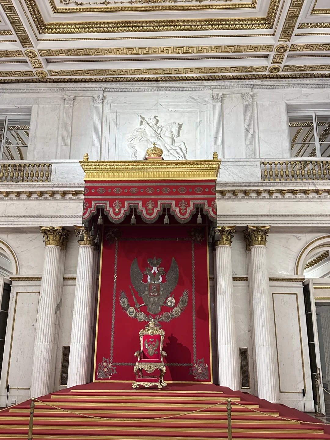 午餐后直冲冬宫!作为世界四大博物馆之一,艾尔米塔什真的藏满惊喜!鎏金穹顶下光影交错,仿佛穿越回罗曼诺夫王朝的鼎盛年代。最幸运的是在214达芬奇厅见到了《利塔圣母》真迹~~圣母哺育圣婴的画面太温柔了,明暗对比的笔触把人性光辉刻画得淋漓尽致,比图片震撼一百倍!还有圣乔治大厅的黄金宝座、灵动到犯规的孔雀大钟,每件文物都在讲解中“活”了过来……