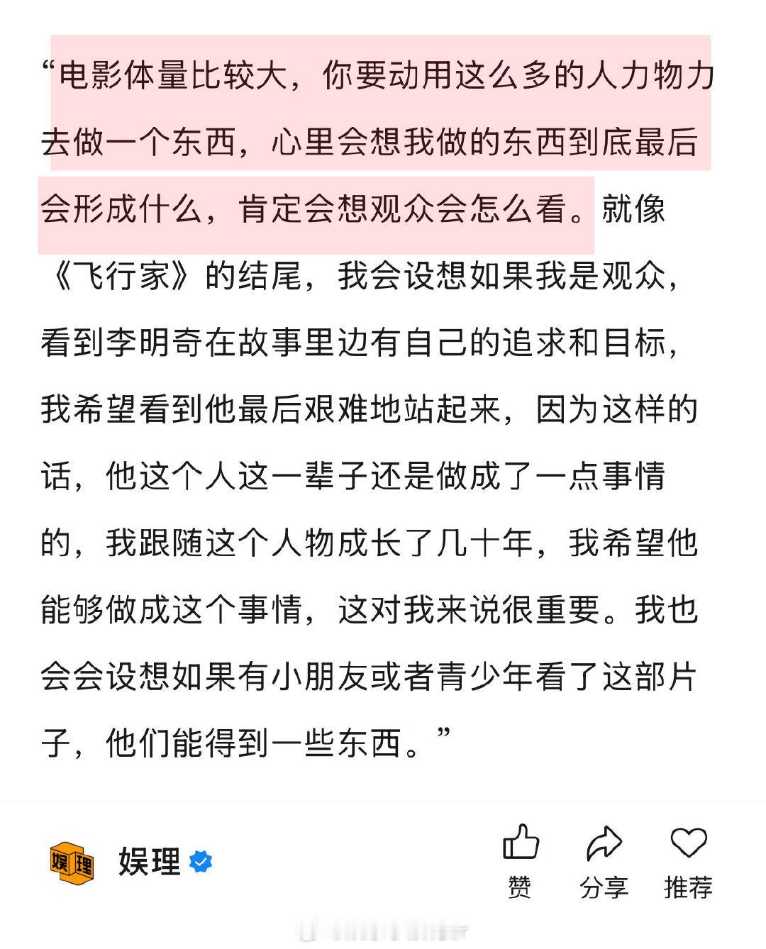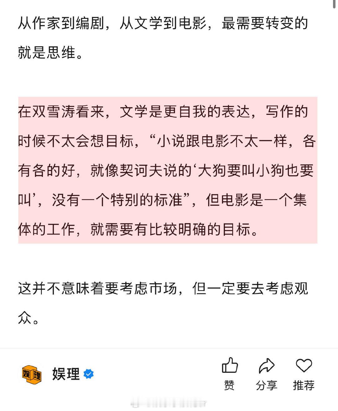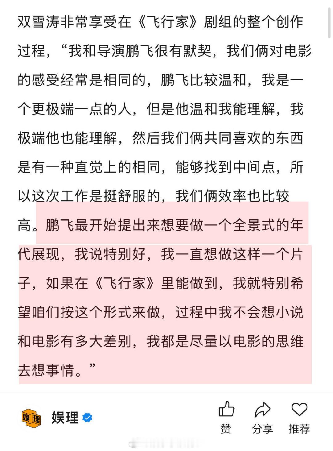 双雪涛回应作品被多次改编 双雪涛喜欢不完全遵从原著的改编 在《飞行家》担任监制之余,首次尝试了编剧一职。“我自己做监制参与的比较多,做了一些编剧相关的工作,大家商量觉得还是写上吧…之前说不做编剧,是说不想在写小说之外,单独再去写剧本,然后交给别人去拍,但是《飞行家》我参与的比较多,全程都在组里,也就顺其自然了。” 娱理独家↓