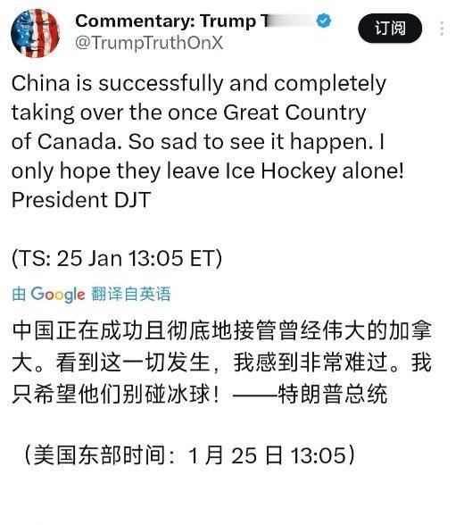特朗普1月26日发文写道:“中国正在成功且彻底地接管曾经伟大的加拿大。看到这一切