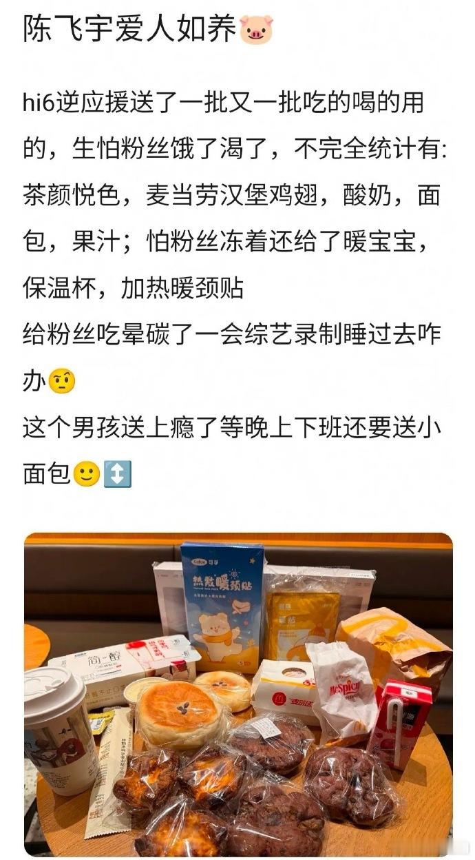 真好啊!陈飞宇hi6逆应援:保温杯、颈贴、暖宝宝、酸奶、奶茶、小面包、汉堡包🍔