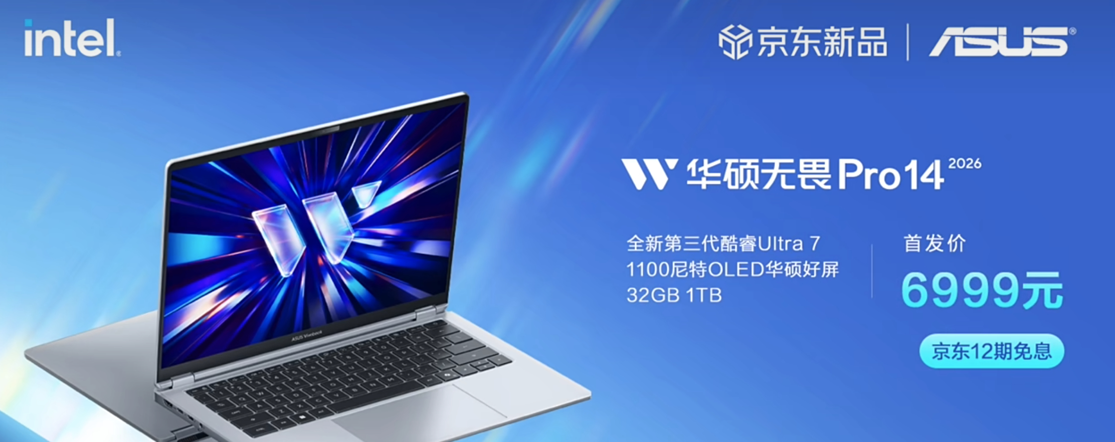 华硕无畏 Pro 14 2026:第三代酷睿 Ultra 7 处理器/32+1TB,首发价 6999 元华硕无畏 Pro 16 2026:第三代酷睿 Ultra X7+32GB+1TB 首发价 7999 元,另外它还有个 Ultra 7 版本,比 X7 版本便宜 700,首发价 7299 元,正常办公用上 Ultra 7 足够了