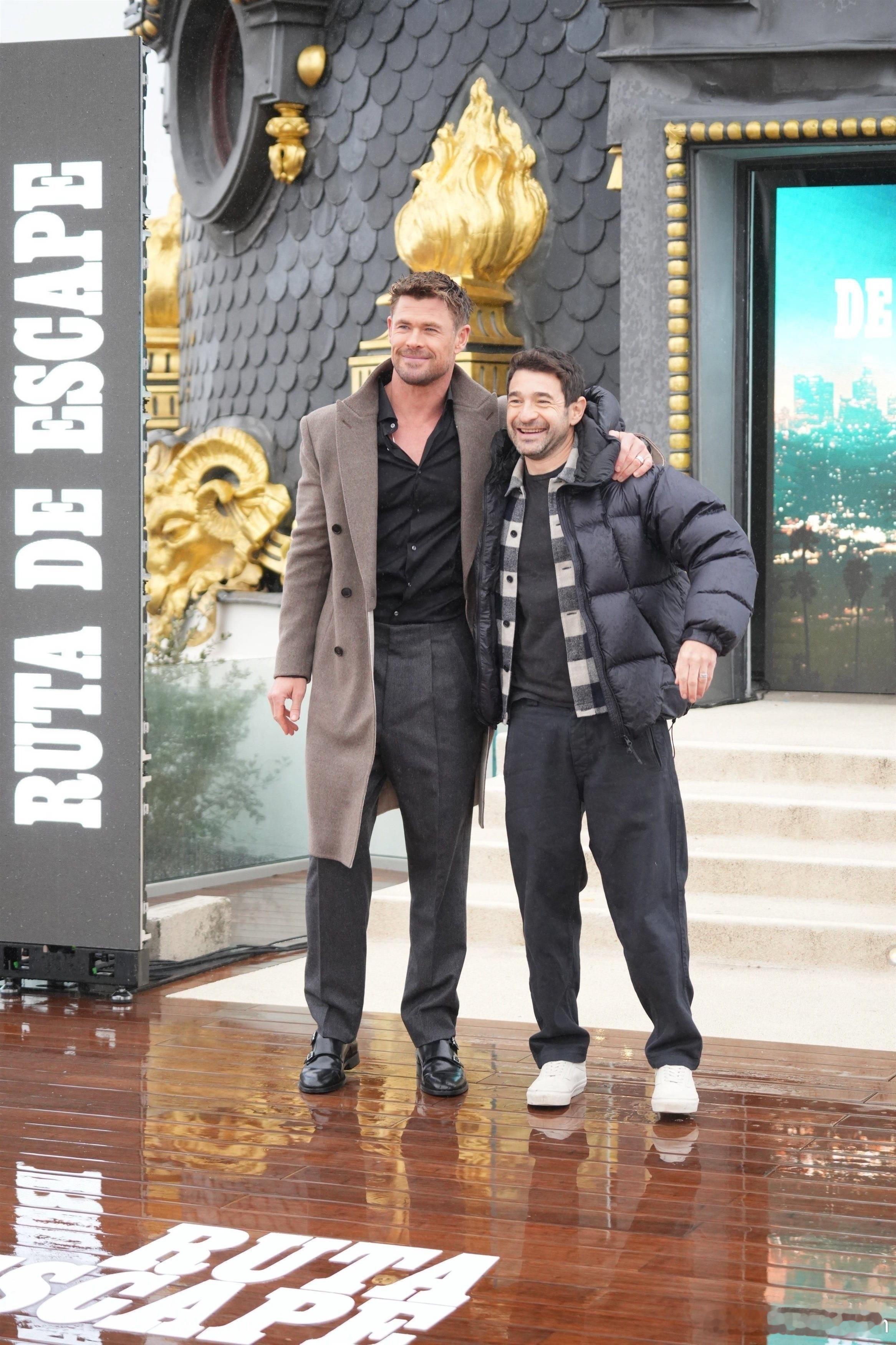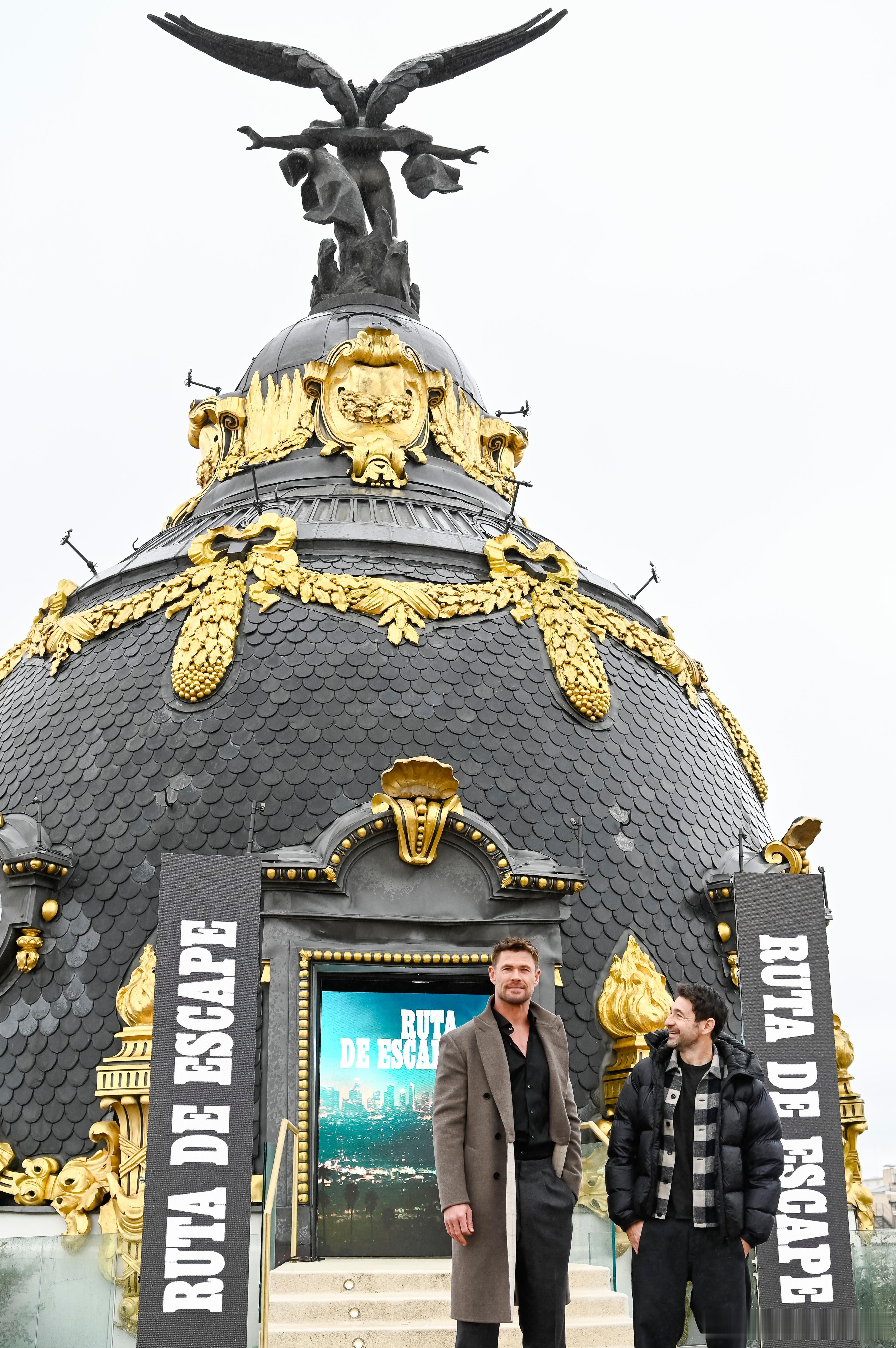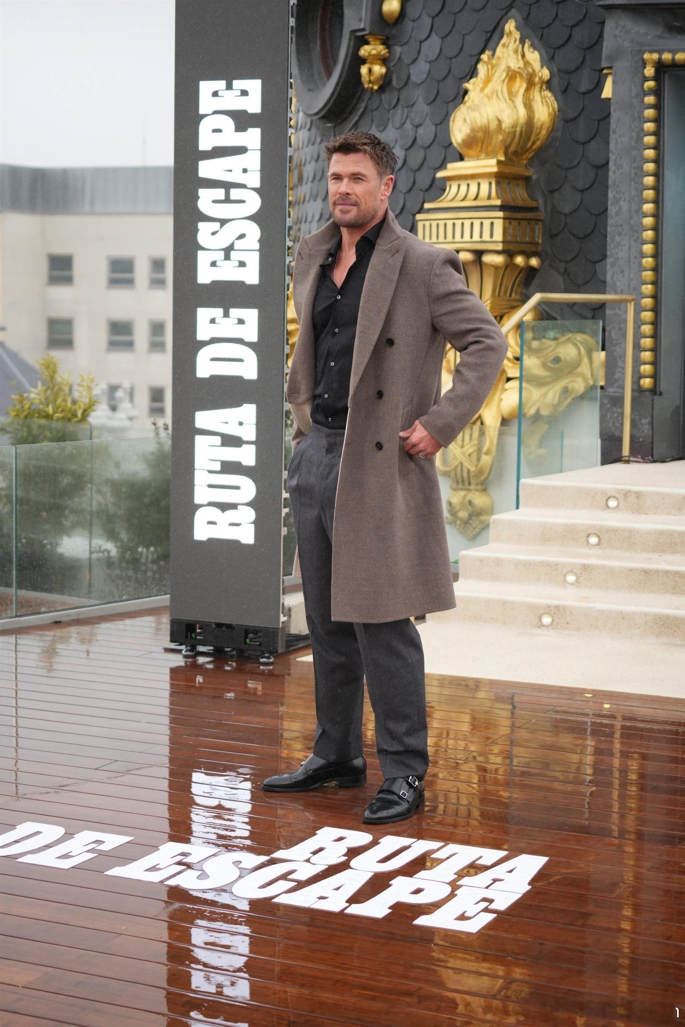 chris hemsworth克里斯海姆斯沃斯在西班牙马德里出席新片《洛杉矶劫案》的photocall,天公不作美,锤哥和导演Bart Layton冒雨登场