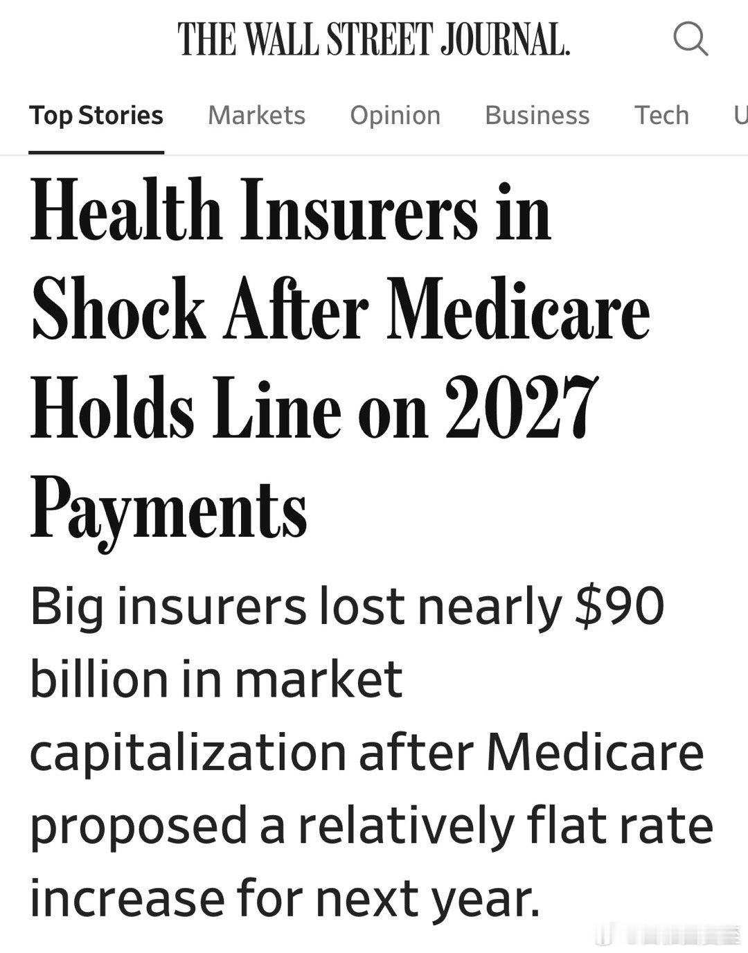 美国联邦医保Medicare,计划中的明年向保险公司支付的比例,低于市场预期各大医疗险企业,股价暴跌,市值蒸发九百亿美元