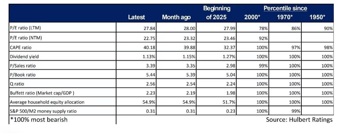 这是对股市回报率预测能力最强的单一指标,此前从未出现过这样的情况美股美股 马克·赫伯特是市场观察的专栏作家。他的Hulbert Ratings服务,跟踪支付固定费用进行审计的投资通讯。个人持股比例是一个反向指标,如今正在发出警告。这个指标基于美国家庭平均持有股票的比例,由“Philosophical Economics”博客的一位匿名作者于2013年提出并命名。指标创始人指出,相较他所知的其他任何估值指标,这个指标对美国股市未来10年回报率的预测效果更好。这一指标基于美国联邦储备委员会按季度汇总的数据进行计算。由于去年秋季联邦政府关门,2025年第三季度的数据直到最近才发布。为海外华人提供有价值的信息与分析,更多内容和全文可在蓝天、电报、x查找causmoney,或直接谷歌搜索caus.com最新数据显示,美国家庭平均股票持有比例已升至54.9%的新高。现在几乎可以肯定,这一比例已经更高。更高的股票配置比例代表悲观信号。图展示了标准普尔500在接下来10年的实际总回报(左侧坐标轴),以及美国家庭平均股票配置比例(右侧坐标轴,数值倒置)之间的关系。为了理解这两组数据之间的强相关性,可以看一个名为r平方(r-squared)的统计量,它衡量一组数据(此处为平均持股比例)对另一组数据(标准普尔500指数未来10年回报率)的预测和解释能力。这个r平方高达59.4%,具有显著统计意义。那么最新的个人持股比例数据究竟有多悲观?我建立了一个计量经济学模型,基于上图中这两组数据的历史相关性。根据模型预测,十年后的标准普尔500指数,在扣除通胀后将年均下跌5.4%。上表列出了我定期更新的10项估值指标的最新数值。这些指标,都是因为对美国股市未来10年回报率具有统计意义上的预测能力而被选中。尽管并非都像平均股票配置比例那样悲观,但整体信号依然偏空。平均来看,这些预测标准普尔500指数未来10年的年均表现将比通胀低2.6%。