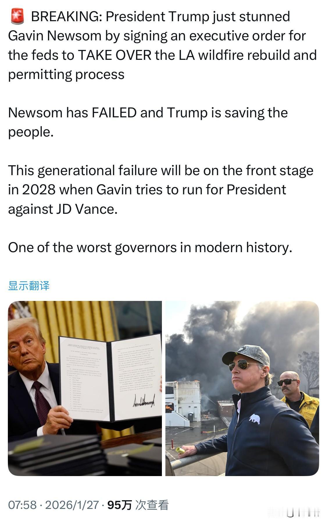 突发新闻:特朗普总统签署了一项行政命令,授权联邦政府接管洛杉矶山火重建和许可审批流程,此举令加州州长加文·纽森震惊不已。 由联邦政府接管洛杉矶火灾后的重建和审批流程,直接把纽森给越过了。火灾是加州民主党造成的,如今他们要再次利用重建机会,进行腐败。特朗普这招等于再次把这群硕鼠的发财之路堵死。纽森还好意思在达沃斯批评特朗普,2025年初的大火,他州长有着不可推卸的责任。纽森这个神经病无疑是现代史上最糟糕的州长之一。