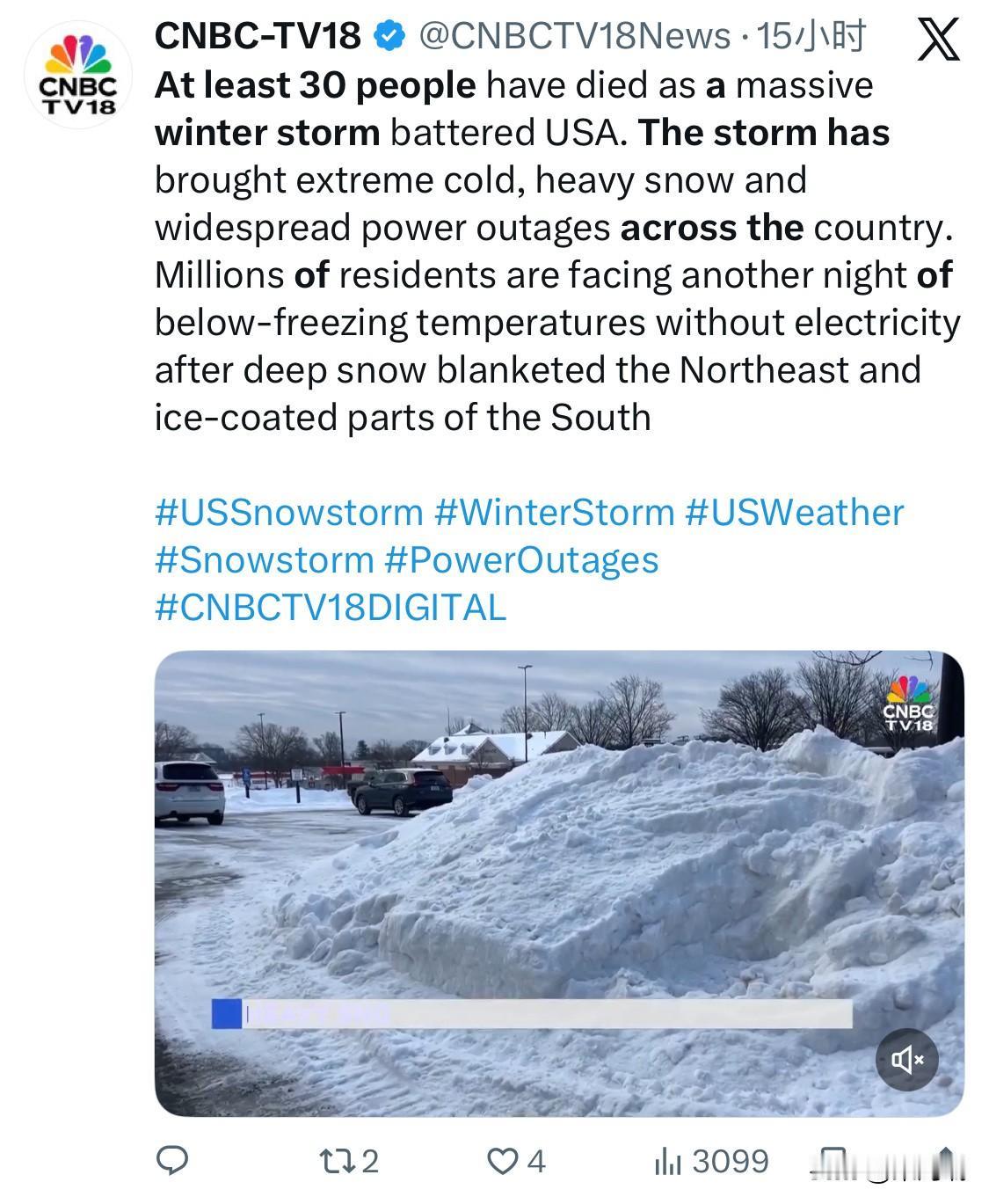 一场席卷美国大部分地区的冬季风暴已造成至少30人死亡,纽约至少有 8 人被发现死