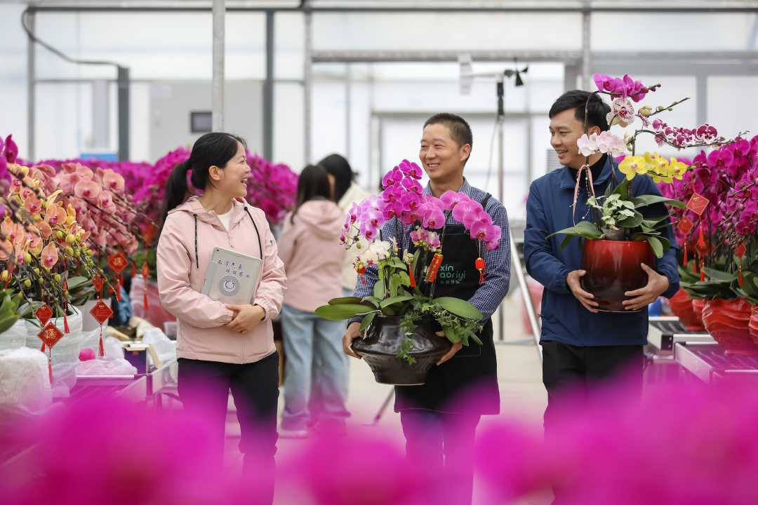 1月27日,福建省福清台湾农民创业园的一家蝴蝶兰培育基地,该市气象局的“数字气象”服务团队正在了解花卉生长状况。