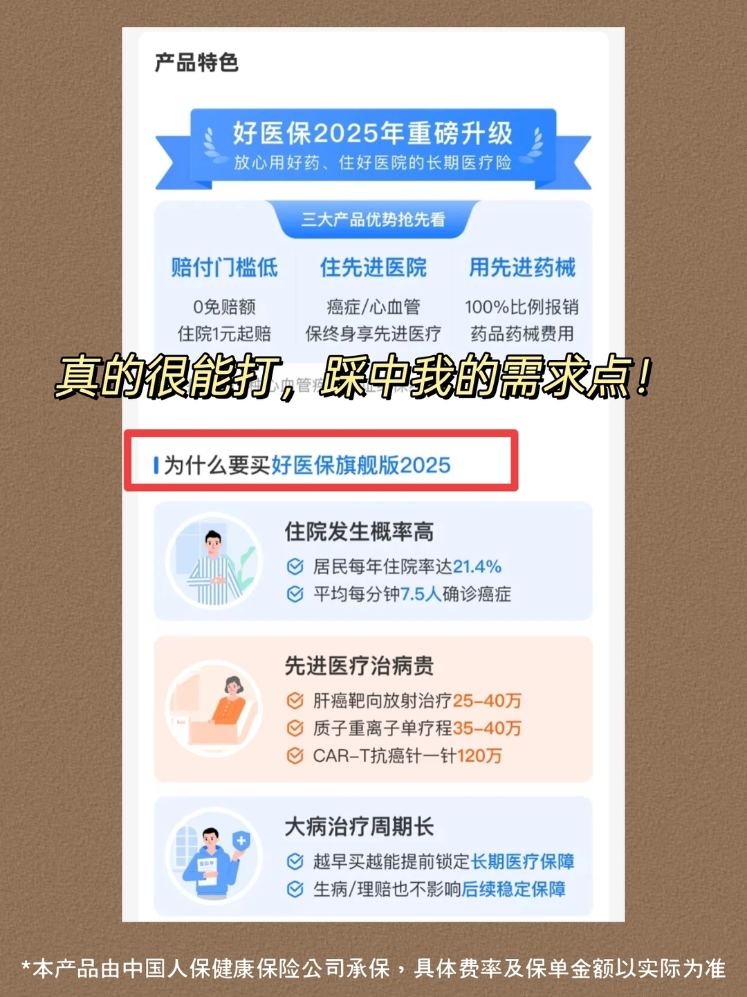 去完医院回来,感触太深了。未来真正压垮我们的,早不是房贷车贷,而是身体亮起的红灯。 医院里永远人挤人,年轻面孔越来越多。我们这代人,前半生拼贷款,后半生恐怕就要拼病历了。 陪护奶奶住院这期间,在医院见多了因病致贫的案例。很多人觉得“百万医疗险”是标配,但传统产品1万的免赔额,其实把很多小病住院挡在了门外,甚至癌症早期的治疗费用都可能够不着起付线。 我一直在深入研究各类医疗险,发现「好医保·长期医疗(旗舰版2025)」真的很能打!它最大的亮点就是打破了传统免赔额的“门槛”🚫: 👉 0免赔额,住院1元起赔 一般疾病住院,1万以下30%比例报销,1万以上100%比例报销;而像癌症和11种心血管疾病直接0免赔额,100%比例报销。这意味着不管是阑尾炎这种小病,还是肿瘤大病,都能有实实在在的赔付,这才是真正的普惠!💖 👉 从医学生的角度看,医疗资源的选择往往比钱更重要。这款产品能覆盖顶级医疗资源,看病不用再纠结性价比✨: ✅ 包含院内外全目录进口药、原研药 ✅ 连120万一针的Car-T都能报 ✅ 院外用药也是0免赔额,100%比例报销 ✅ 更贴心的是,遇上大病可以去三甲国际部、特需部甚至质子重离子中心 直接用好药,不用在疗效和钱包之间做选择题🧾。 👉 最后是稳定性,最长保证续保终身,长期医疗有保障,癌症和11种心血管疾病保证续保终身,一般疾病也能续保20年。不用担心生病后产品停售或被拒保! 🙅‍♀️真正的科学防护,是给自己一份确定的兜底保障,去支付宝搜🔍【好医保旗舰版】就能看到~每月30几块,就能换来一份安心保障~ *本产品由中国人保健康保险公司承保,具体费率及保单金额以实际为准