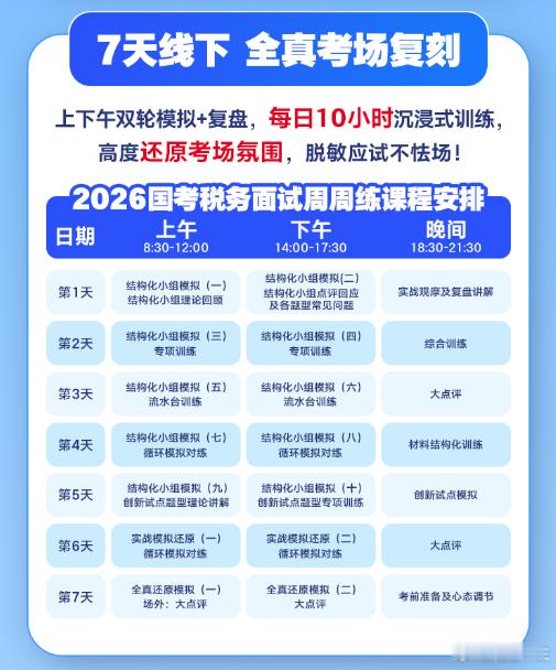 四海26国考税务线下面试“周周练”正式上线!开课时间:2月22号-2月28号(1期),3月2号-3月8号(2期)开课城市:杭州、沈阳、郑州、武汉、济南、南京课程价格:7天3980(不含食宿)课程安排:可见图三国考国考面试26国考