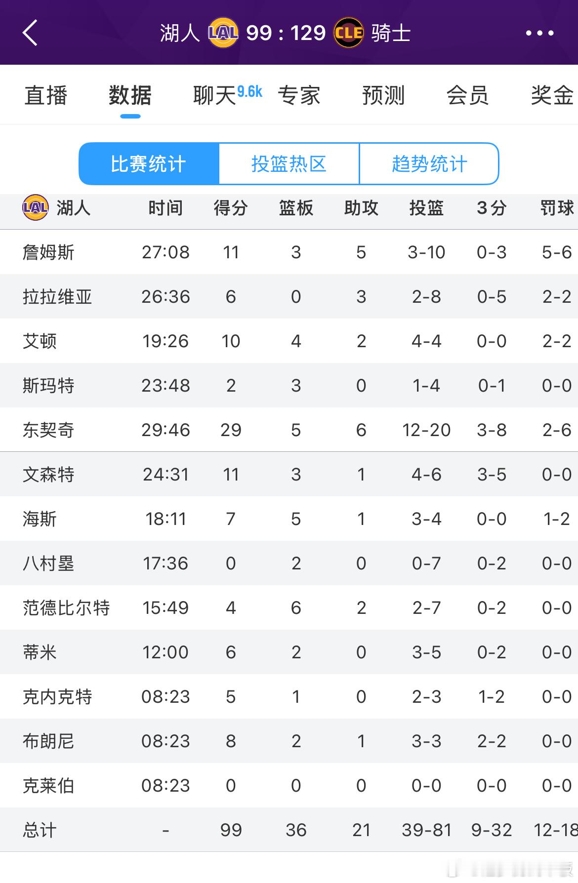 湖人客场99-129溃败骑士,下一场打奇才东契奇29分5板6助,詹姆斯11分,文森特11分湖人vs骑士